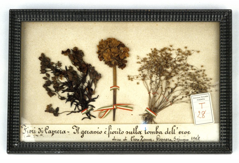 Il cimelio è stato composto con i fiori raccolti sulla tomba di Giuseppe Garibaldi a Caprera. Giuseppe Garibaldi nacque a Nizza il 4 luglio 1807. Uomo di spicco del risorgimento italiano, fu impegnato in prima persona nei moti insurrezionali per l'unità nazionale. Nel 1860, grazie all'appoggio di Vittorio Emanuele II, guidò la spedizione dei Mille che portò alla formazione del Regno d'Italia. Prese parte con valore anche alle altre guerre d'indipendenza nazionale. Morì nel suo rifugio sardo sull'isola di Caprera il 2 giugno 1882.