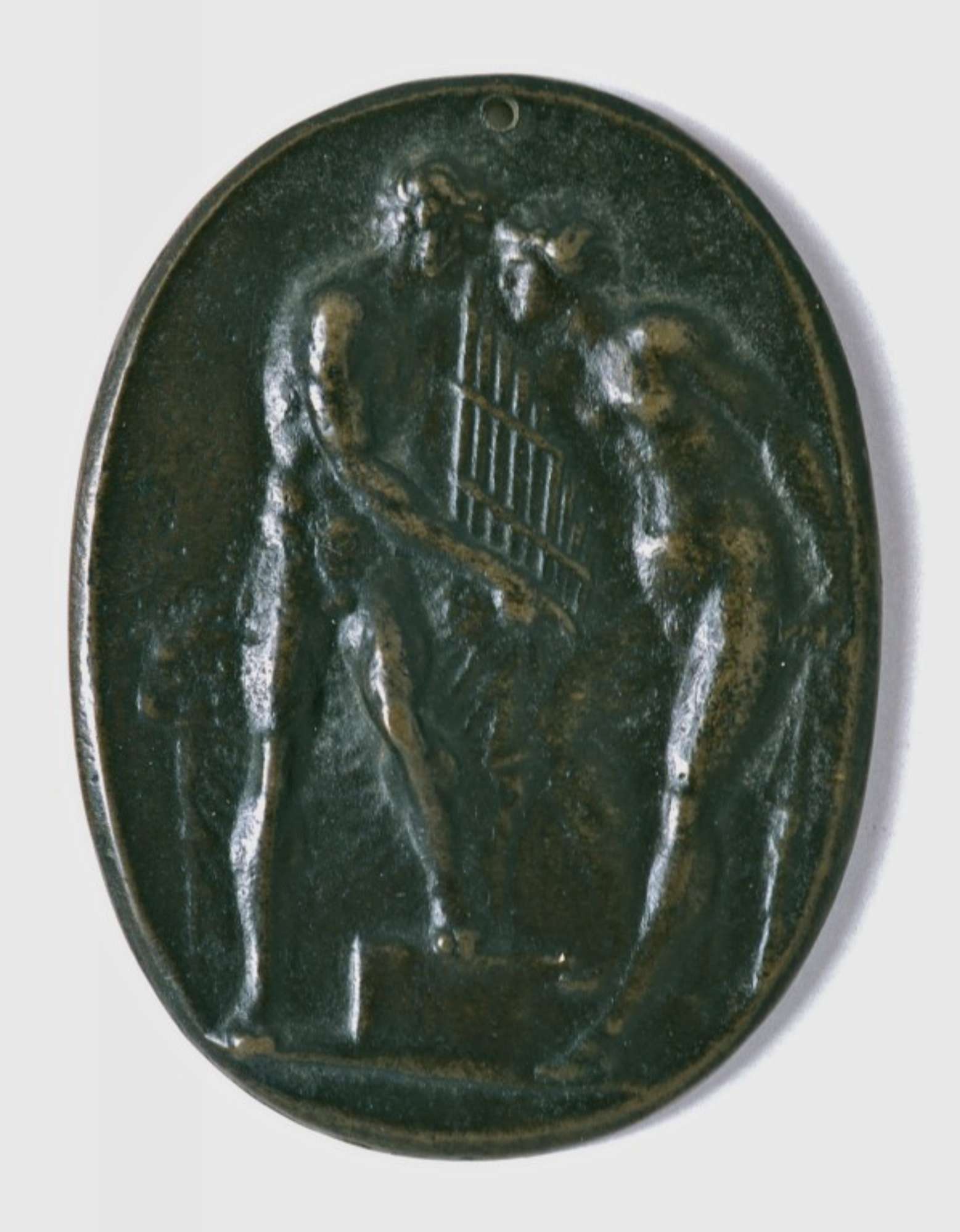 La medaglia ritrae Pan e la ninfa Siringa a figura intera, nudi, vicino ad un'arpa.