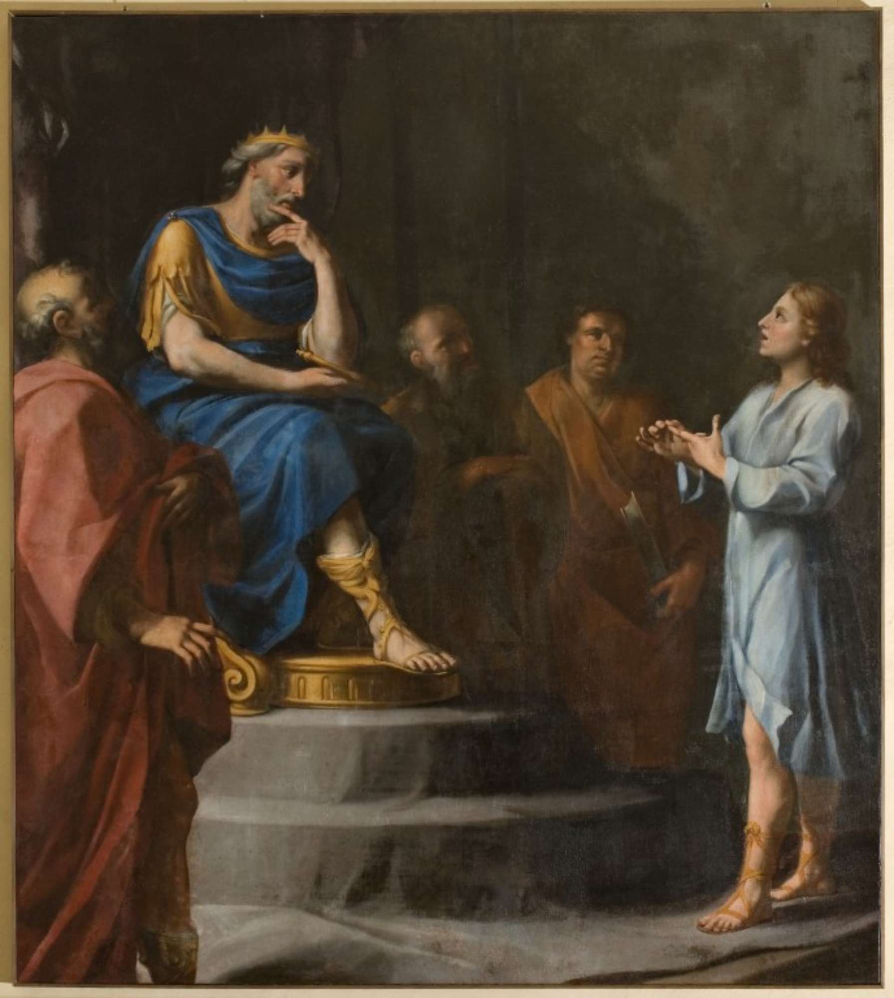Giuseppe è in primo piano a destra mentre il Faraone è assiso in trono; alla sinistra è un astante che funge da quinta; altri due dignitari affiancano il monarca sui gradini del trono.