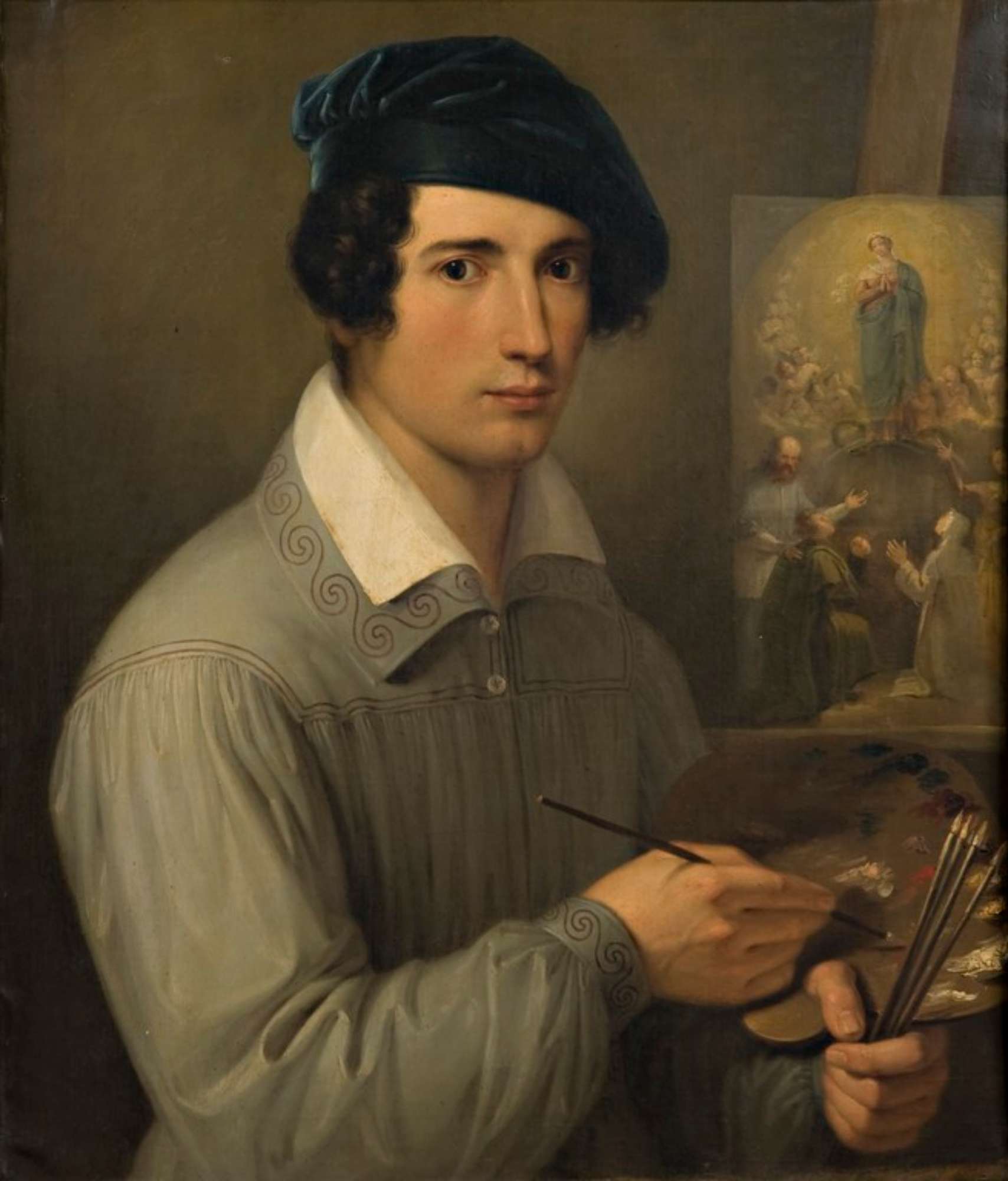 L'opera ritrae il pittore, rivolto verso lo spettatore, con berretta blu e tavolozza e pennelli nelle mani, intento a lavorare ad un bozzetto, raffigurante l'Immacolata Concezione.