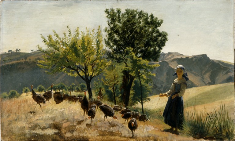 L'opera raffigura una donna con alcuni tacchini su una collinetta, a fianco di alberi. In fondo, vi sono alcune montagne.