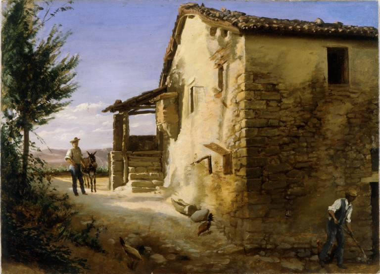 L'opera raffigura una casa colonica in parte alla luce del sole, in parte in ombra. Sulla destra, è ritratto un uomo al lavoro con la vanga, sulla sinistra, un altro con un asinello.