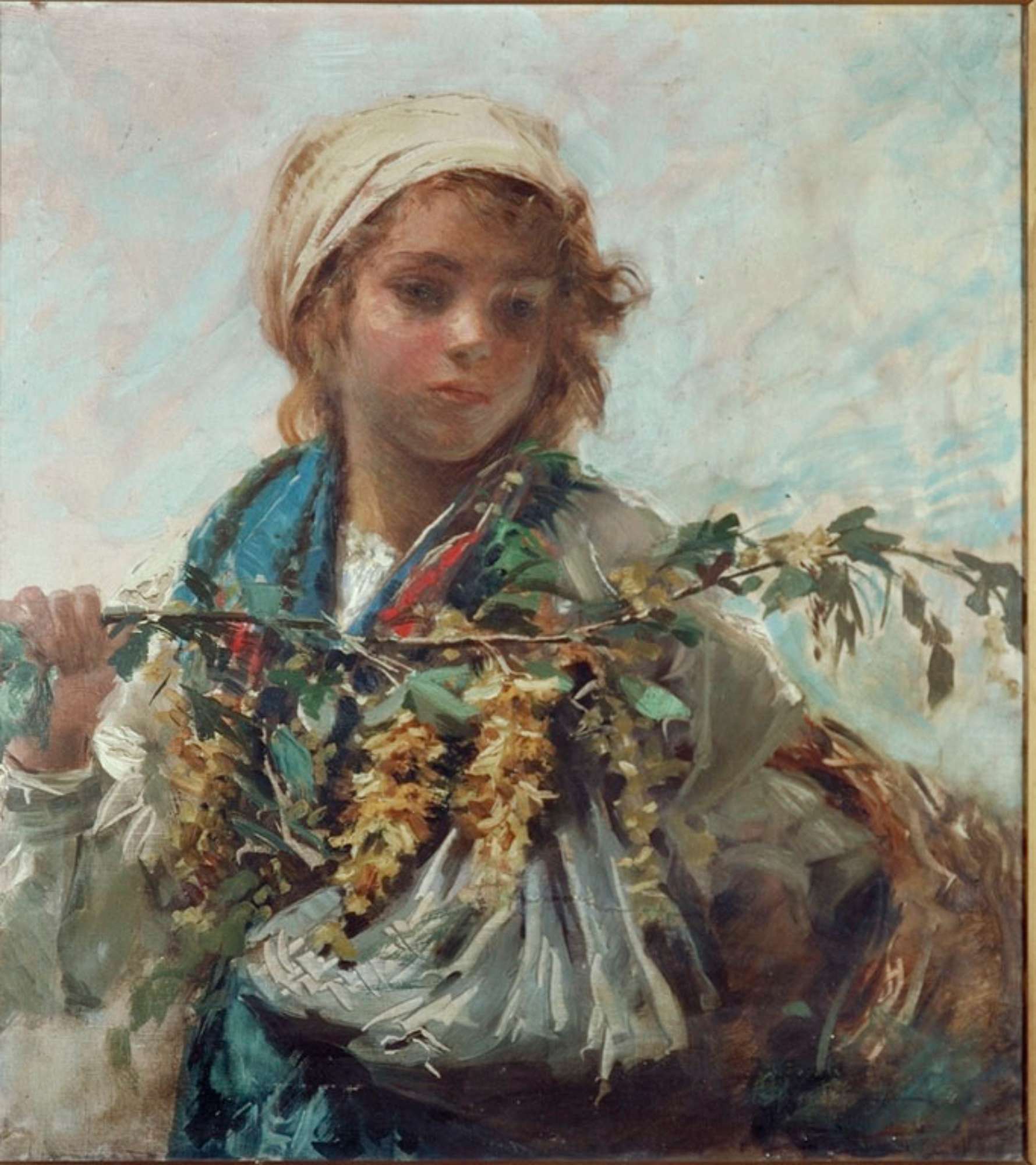 Ritratto di "genere". Una giovane contadina in abiti tradizionali e fazzoletto in testa regge erbe di campo con una mano.