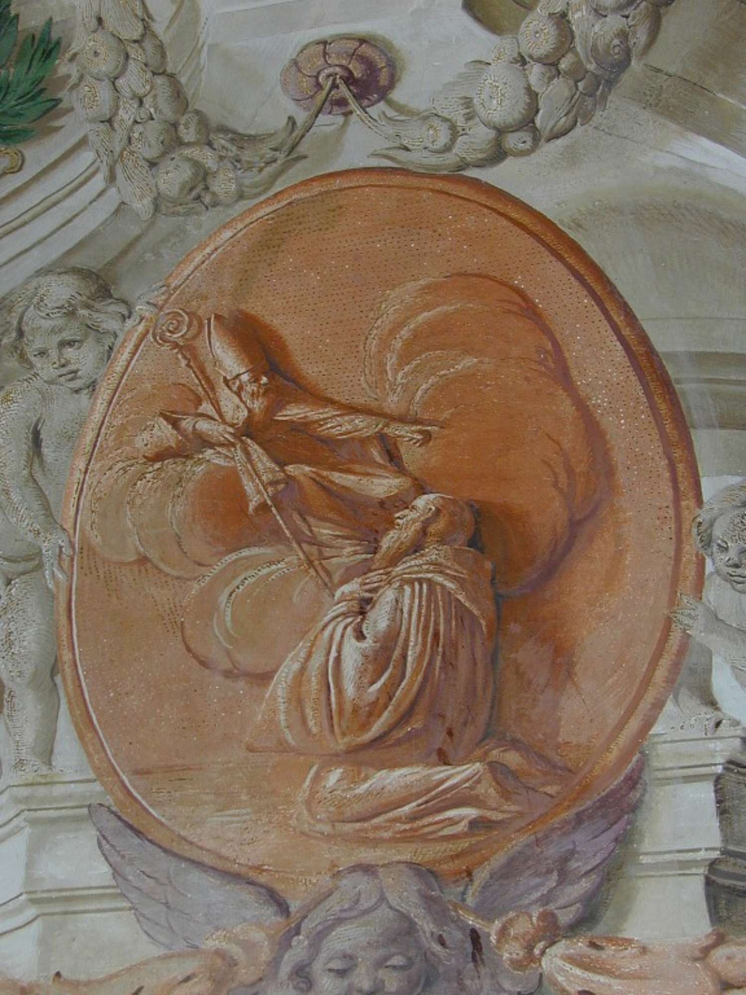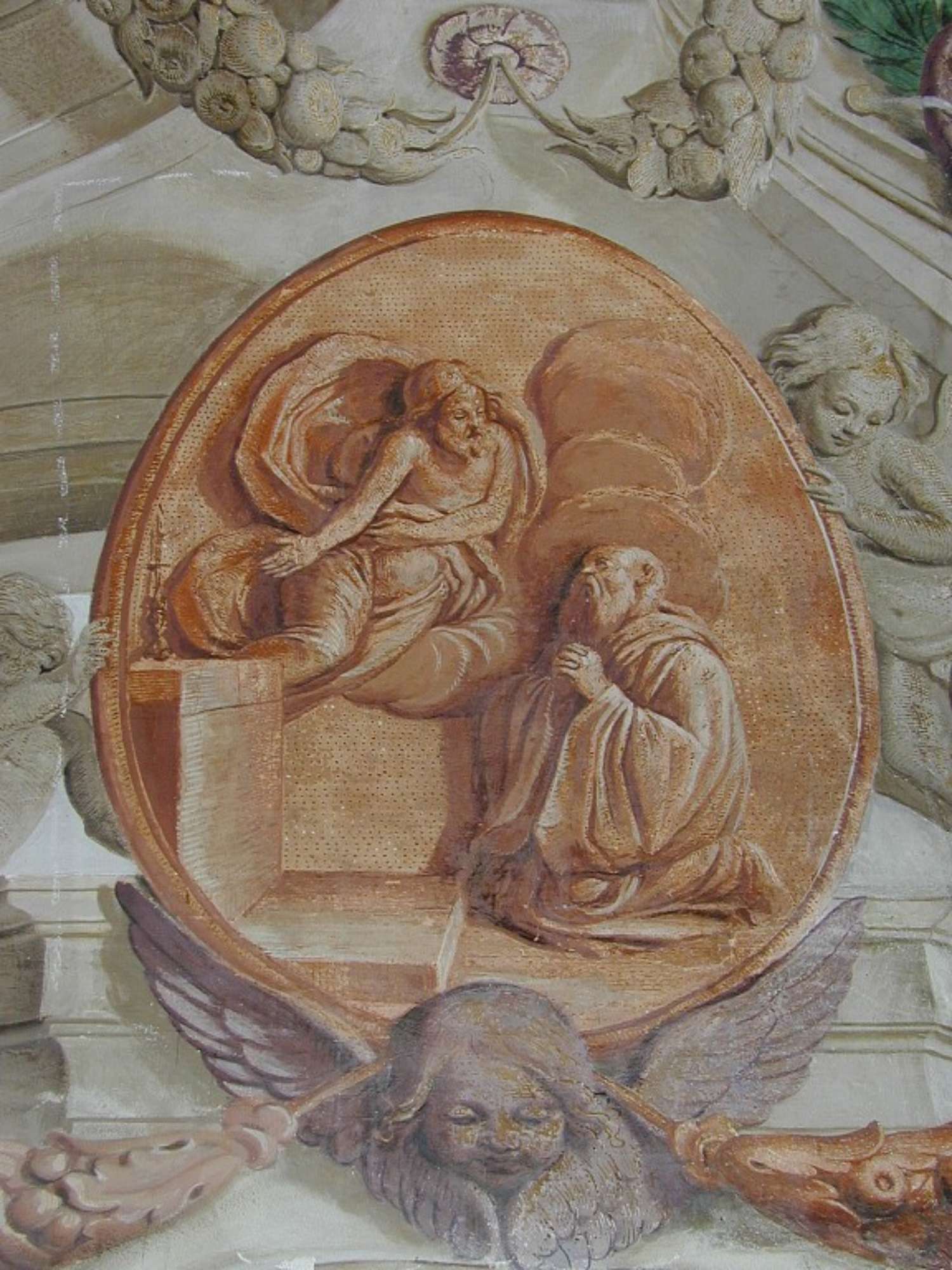 La decorazione è distribuita su tutta la superficie della cupola e delle due imbotti laterali; raffigura architetture dipinte e ornati vari, nonché puttini che sorreggono medaglioni dipinti in monocromo giallastro, che sinteticamente illustrano episodi camaldolesi, alcuni dei quali relativi alla vita di San Romualdo. Nei pennacchi, sotto l'imposta della cupola, quattro ovali in monocromo grigiastro recano altrettanti profeti che esibiscono tabelle con iscrizioni. Alla sommità della cupola e nelle imbotti laterali ad essa è un cielo aperto nel quale sono inserite figurette angeliche volanti.