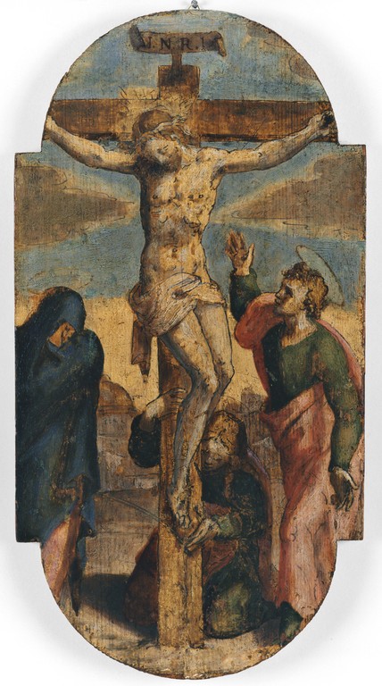 Piccola tavola ad olio raffigurante la Crocifissione. Fa parte di un ciclo dei Misteri del Rosario ora smembrato.