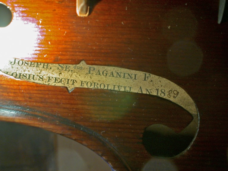 Di questo strumento non compaiono gli estremi di acquisizione da parte del Comune di Forlì in alcuna documentazione. Non è presente nell'elenco del lascito di Alba Paganini all'orfanotrofio. La mano è incerta e lo stile di Giuseppe Secondo non è ancora identificabile, se non nello scavo del riccio. In ordine temporale si dovrebbe trattare del secondo violino in questa collezione, dopo quello costruito a 17 anni, in possesso del Museo del Teatro. Giuseppe Secondo dovrebbe averlo costruito all'età di 19 anni.