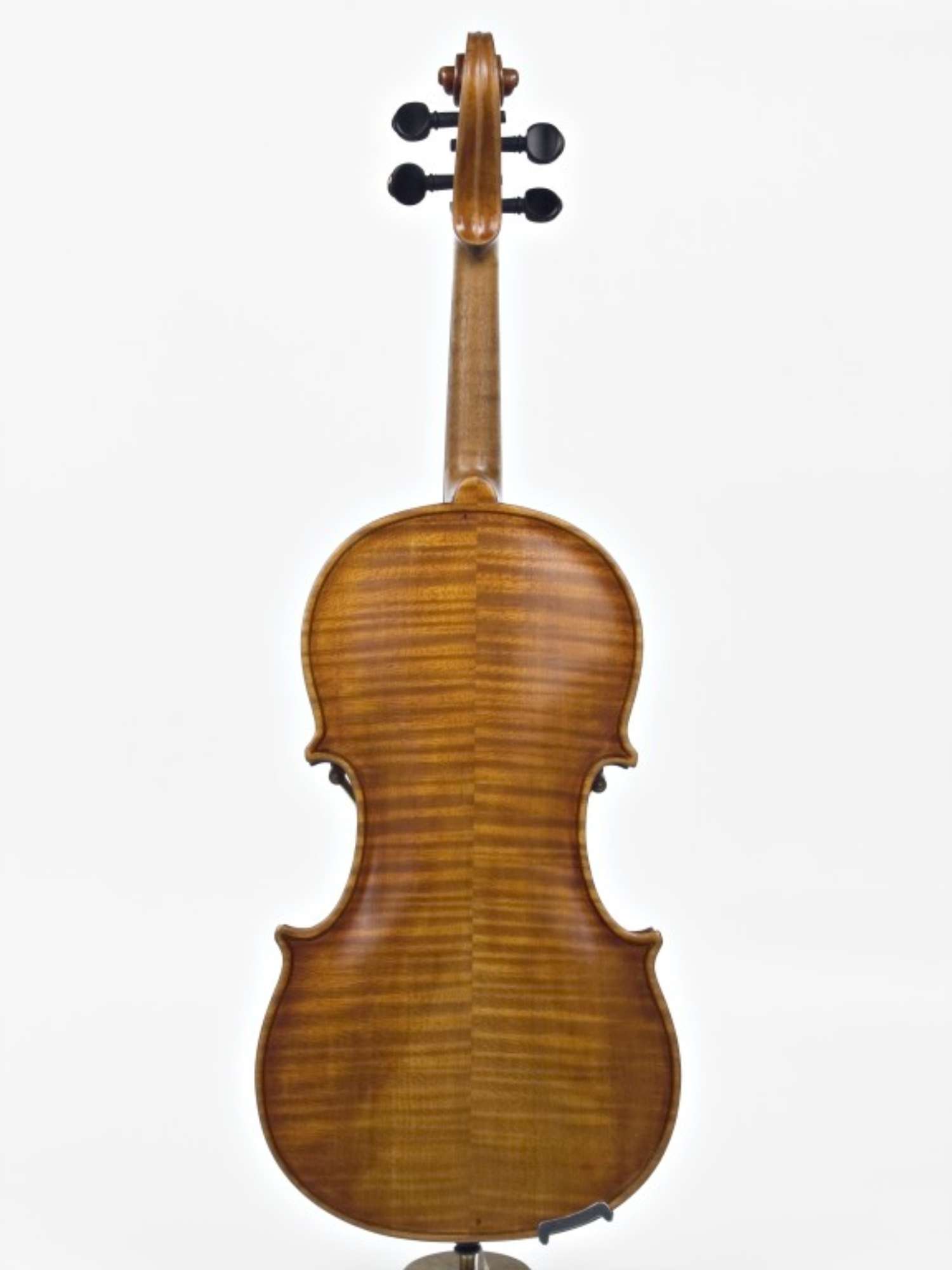 Il fondo è in due pezzi di acero con marezzatura media, perpendicolare alla giunta, la sguscia esterna è larga e poco pronunciata. Le fasce sono dello stesso legno del fondo e della testa. La tavola è in due pezzi di abete a venatura fine irregolare con anelli annuali poco marcati. La sguscia del bordo è simile a quella del fondo e poco pronunciata, le punte sono leggermente scaricate, meno che negli strumenti del padre. La testa è in acero. La chiocciola è piccola e ha un disegno irregolare piacevole con la voluta che si stringe all'inizio per riallargarsi all'ultima spira. Un foro di tarlo riparato con legno si vede nel lato dei gravi del riccio e un altro sullo spigolo del dorso. Il filetto è sottile, ha il bianco in acero ed è inserito in modo impreciso, specie sul piano. I tasselli interni e le controfasce sono in abete. La tastiera è di ebano leggermente alleggerita inferiormente. La cordiera è pure di ebano. I piroli sono di ebano. Il bottone della cordiera è di ebano. La mentoniera è di ebanite. La vernice è di colore aranciato, ritoccata. Sotto le corde un cattivo ritocco a pennello imita la pece normalmente depositata dallo strofinamento dell'archetto sulle corde. Tutto lo strumento è spalmato di un olio non siccativo.