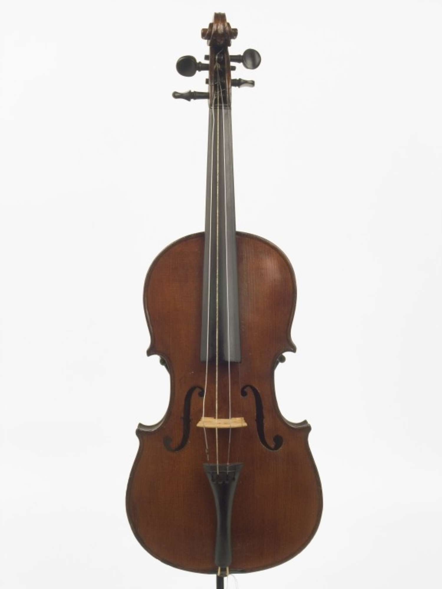 Il fondo è in due pezzi non simmetrici di acero, marezzatura fine e irregolare posizionata all'esterno. La sguscia esterna è larga, mentre la bombatura è regolare. Le punte sono solo leggermente scaricate. Le fasce sono dello stesso legno del fondo e della testa. La tavola è in due pezzi di abete a venatura fine e media irregolare che si allarga verso i bordi con anelli annuali marcati ma poco visibili per via della vernice. La sguscia del bordo è simile a quella del fondo. La testa è in acero e la chiocciola è regolare. Il filetto è di legno con la parte bianca molto stretta. Le controfasce sono in abete e lo strumento è costruito senza tasselli delle punte. La tastiera e la cordiera sono di legno tinto. I piroli sono di diversa fattura. Il bottone della cordiera è di ebano. La vernice è di colore rossastro, ritoccata sui bordi, fasce e testa con una vernice bruna. Lo strumento è spalmato di un olio non siccativo.