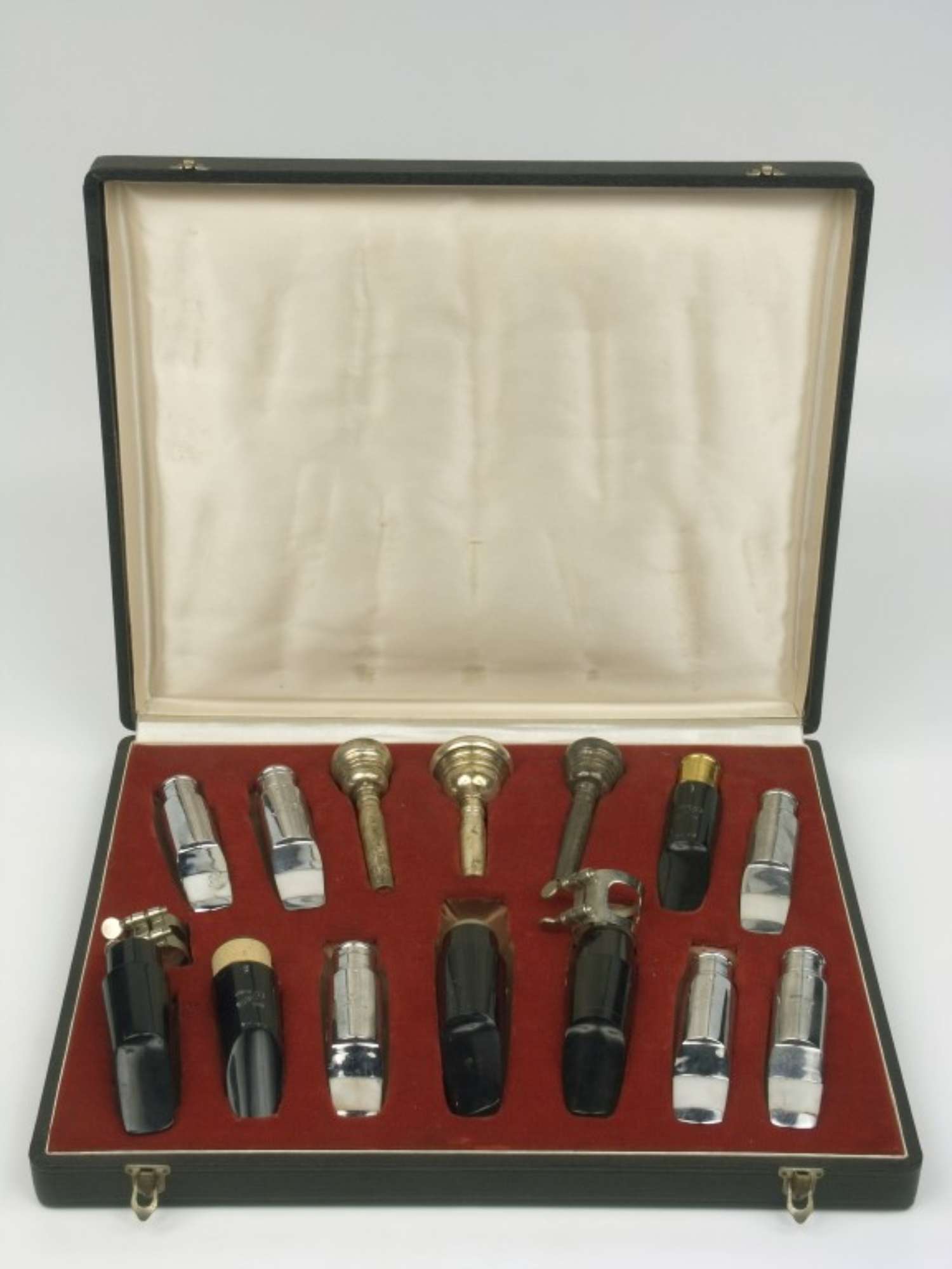 Scatola campionaria di quattordici bocchini assortiti per strumenti a fiato e due fascette strigere l'ancia. La scatola è rivestita esternamente in pelle nera e foderata internamente di velluto rosso e raso bianco.