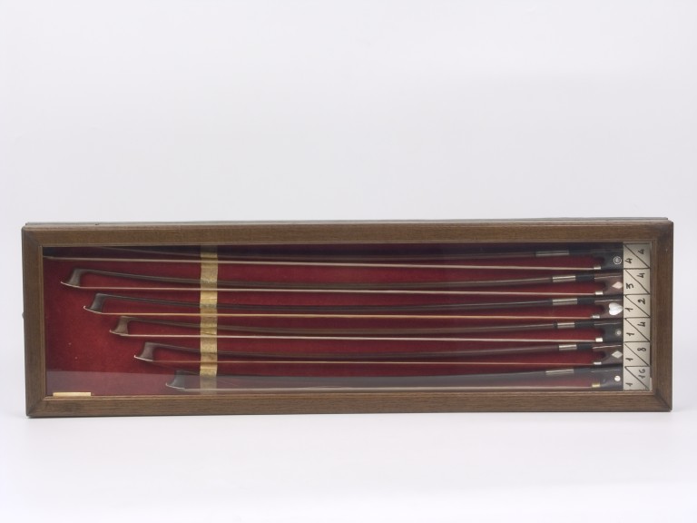 L'arco fa parte di una serie di sei archi di diversa misura, entrati nella collezione nell'ottobre 1992 e donati dal liutaio Alceo Bellini in memoria dei genitori. Del liutaio nato a Civitella di Romagna il 12/02/23, morto a Forlì il 4/12/97, non si hanno molte notizie. Non figura nei repertori dei costruttori e, a giudicare dagli archetti da lui costruiti e dal restauro del bassetto inv. n. 727, si deve trattare di un liutaio dilettante autodidatta non eccelso.