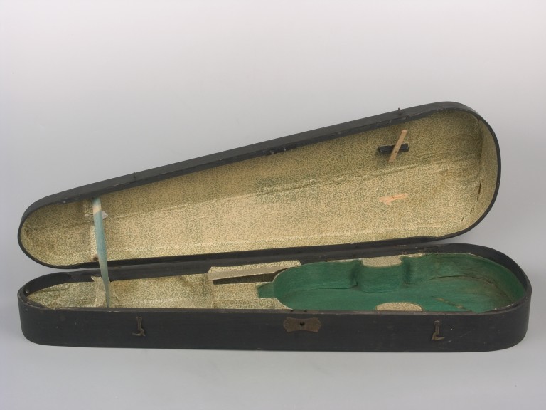 Custodia per violino in legno di abete tinto di nero. Forma con estremità arrotondate. La custodia ha una serratura con chiave e due ganci di chiusura. Internamente è rivestita di carta a motivi floreali e panno verde. Ha un fermo per un archetto e due vani per gli accessori. Ferramenta in ottone.