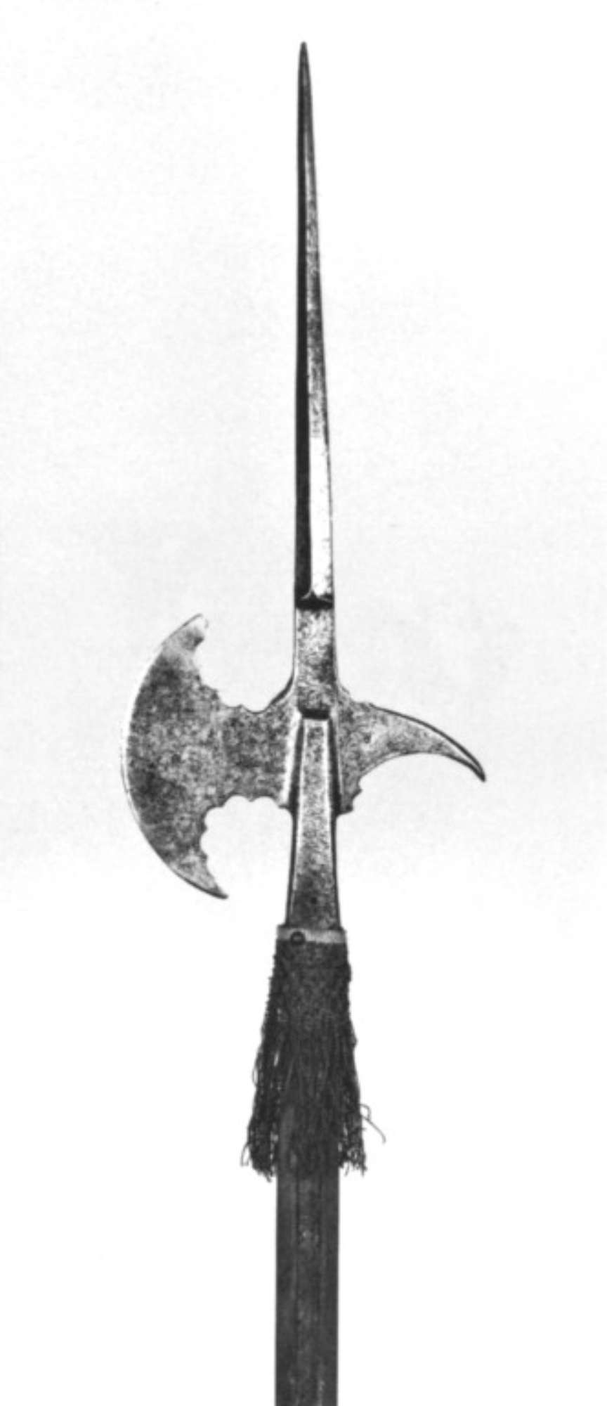 Arma in asta con ferro composto da un lato da una scure ampia e bombata e dall'altro da un aguzzo becco di falco. In alto, sull'asse dell'asta, sporge una cuspide a quadrello.