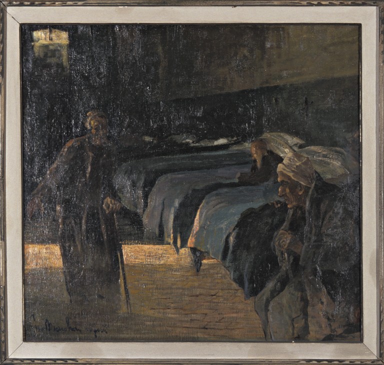 Interno d'ospedale con anziani ricoverati. Tonalità cupe.