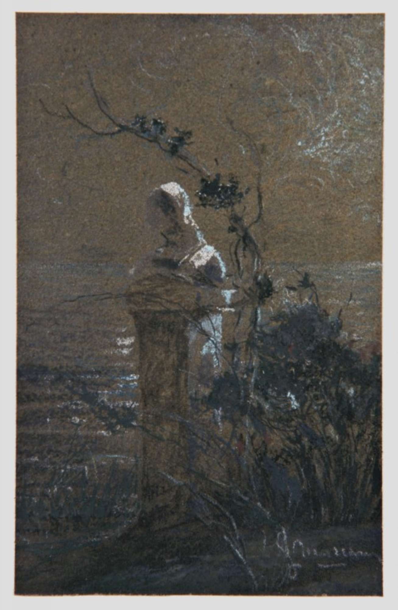 L'immagine è appena accennata e resa con lumeggiature a pastello e tratti neri: in un paesaggio notturno un busto su di un piedistallo è vicino ad un alberello.