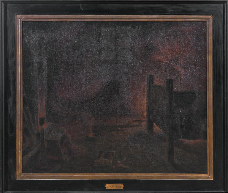 Interno di camera al buio illuminata dai bagliori di luce rossa del camino.