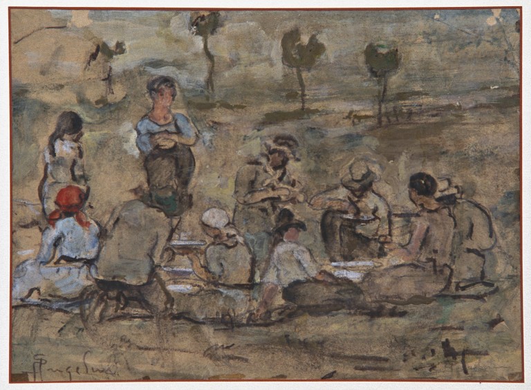 Figure di uomini e donne intenti a desinare in una radura di campagna.