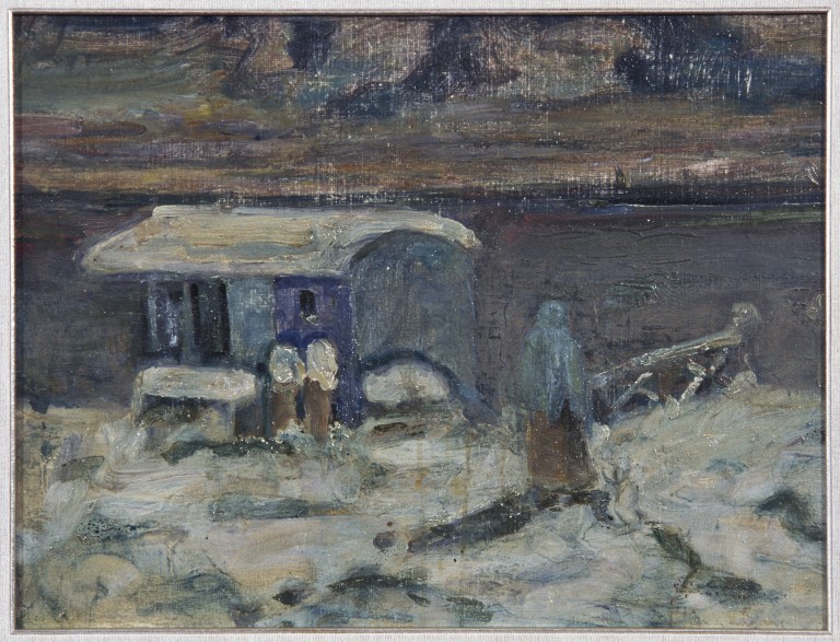 Paesaggio con neve: una baracca e una figura di donna con scialle in attesa. Toni azzurro-verdi-grigi.