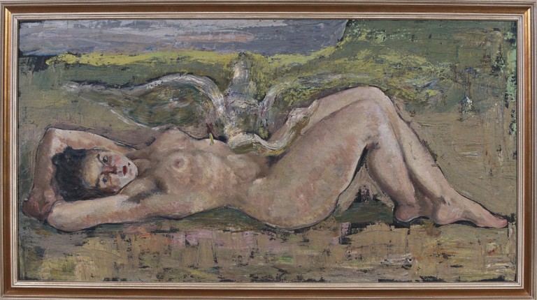 Grande nudo di donna sdraiata in campagna. Il nudo è dipinto a pennello, il circostante a spatola. Colori sporchi. Il dipinto è presumibilmente non finito.