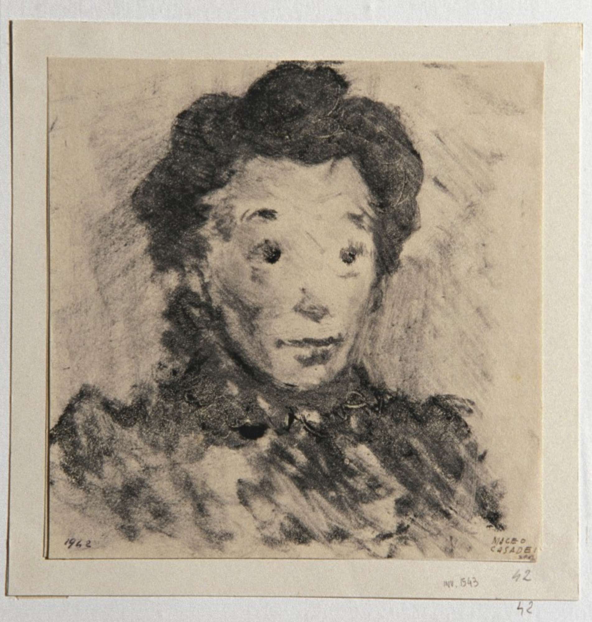 Monotipo raffigurante figura femminile vista quasi frontalmente.