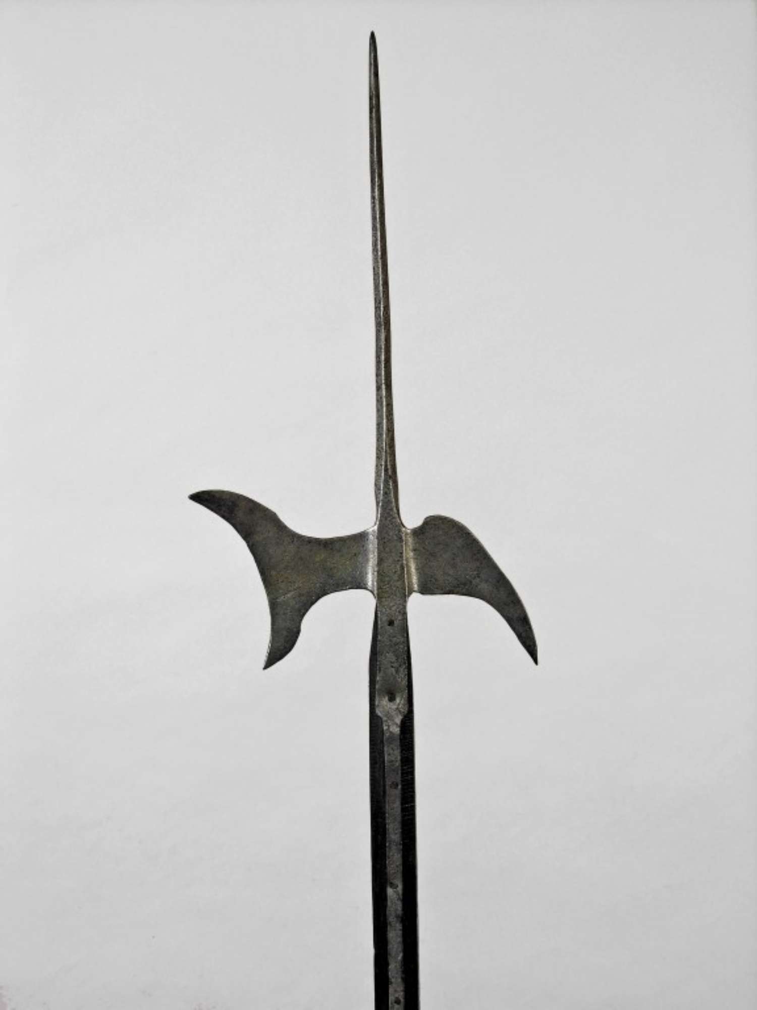 Gorbia in tronco di piramide a sezione rettangola, raccordata al ferro con scalinature modellate, proseguente nelle patte laterali e nelle bandelle. La scure acutamente lunata e il becco di falco sono lisci. Il ferro prosegue con una cuspide a quadrello.