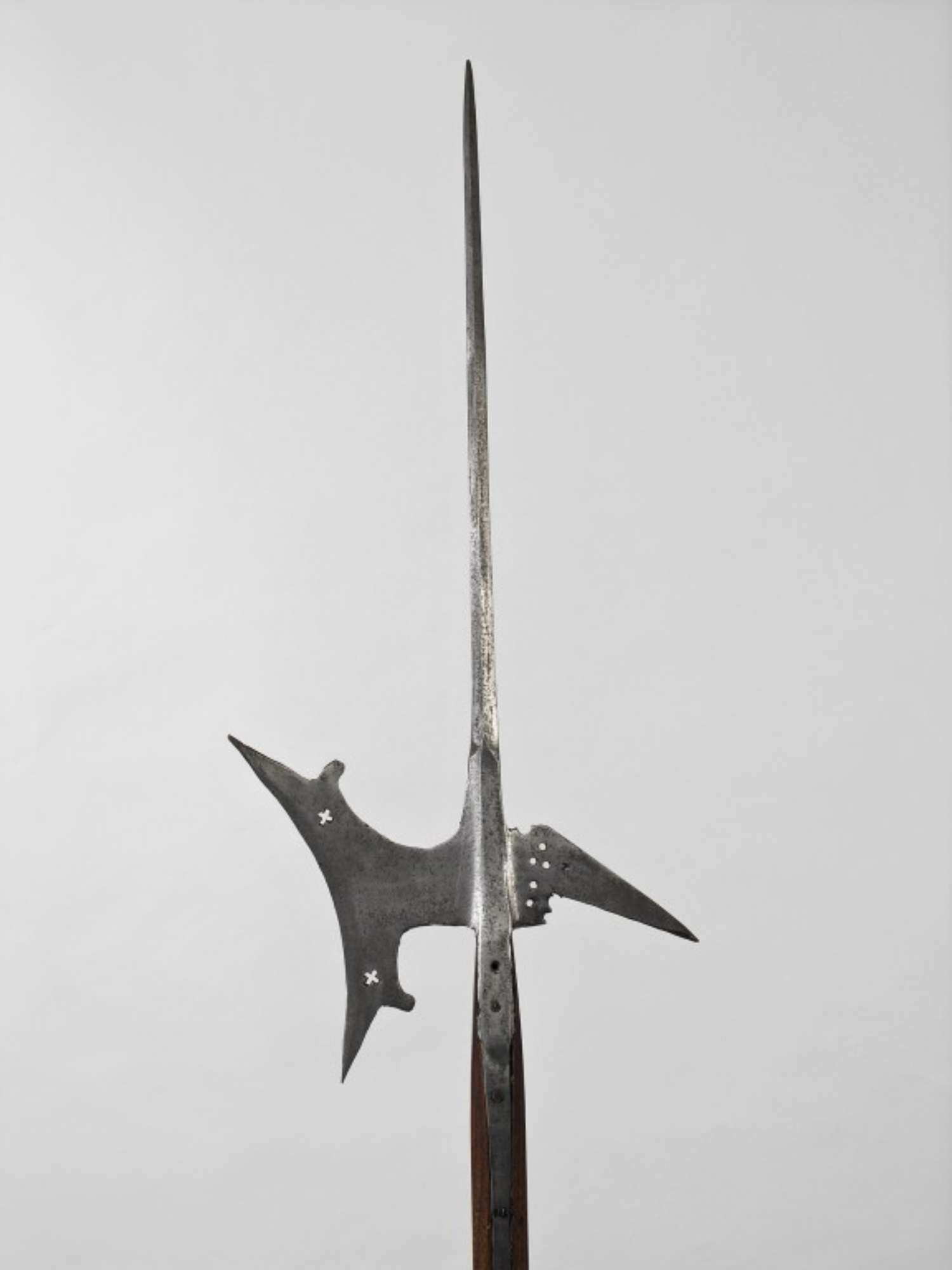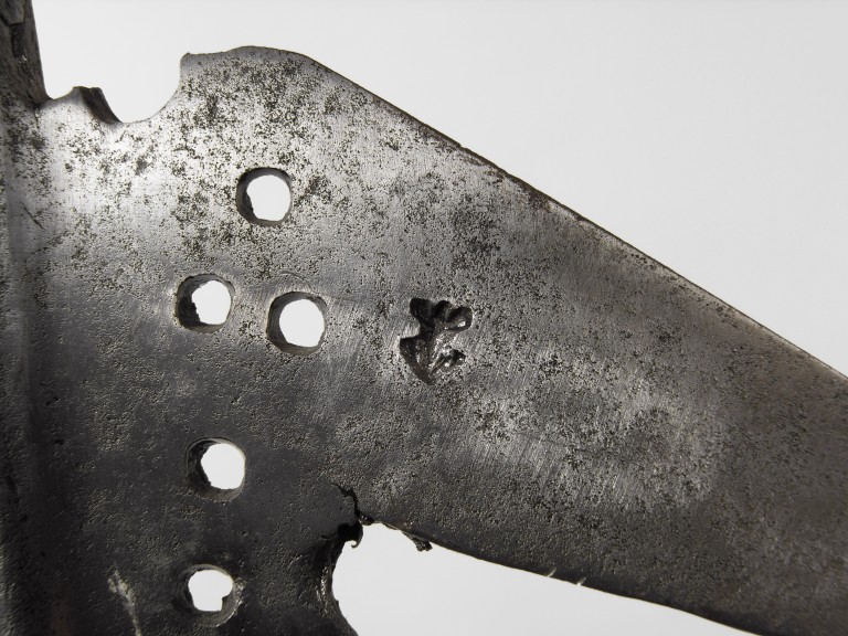 L'alabarda è marcata nel becco di corvo da una sorta di rocchio, notissima marca italiana che compare su armi in asta e bianche di vari tipi. Nella stessa Armeria Albicini si veda l'alabarda di cui alla scheda n° 00000065. Per una lista di altri ferri con la stessa punzonatura si rimanda all'elenco riportato da Boccia nel catalogo dell'Armeria del Museo medievale di Bologna (p. 156).