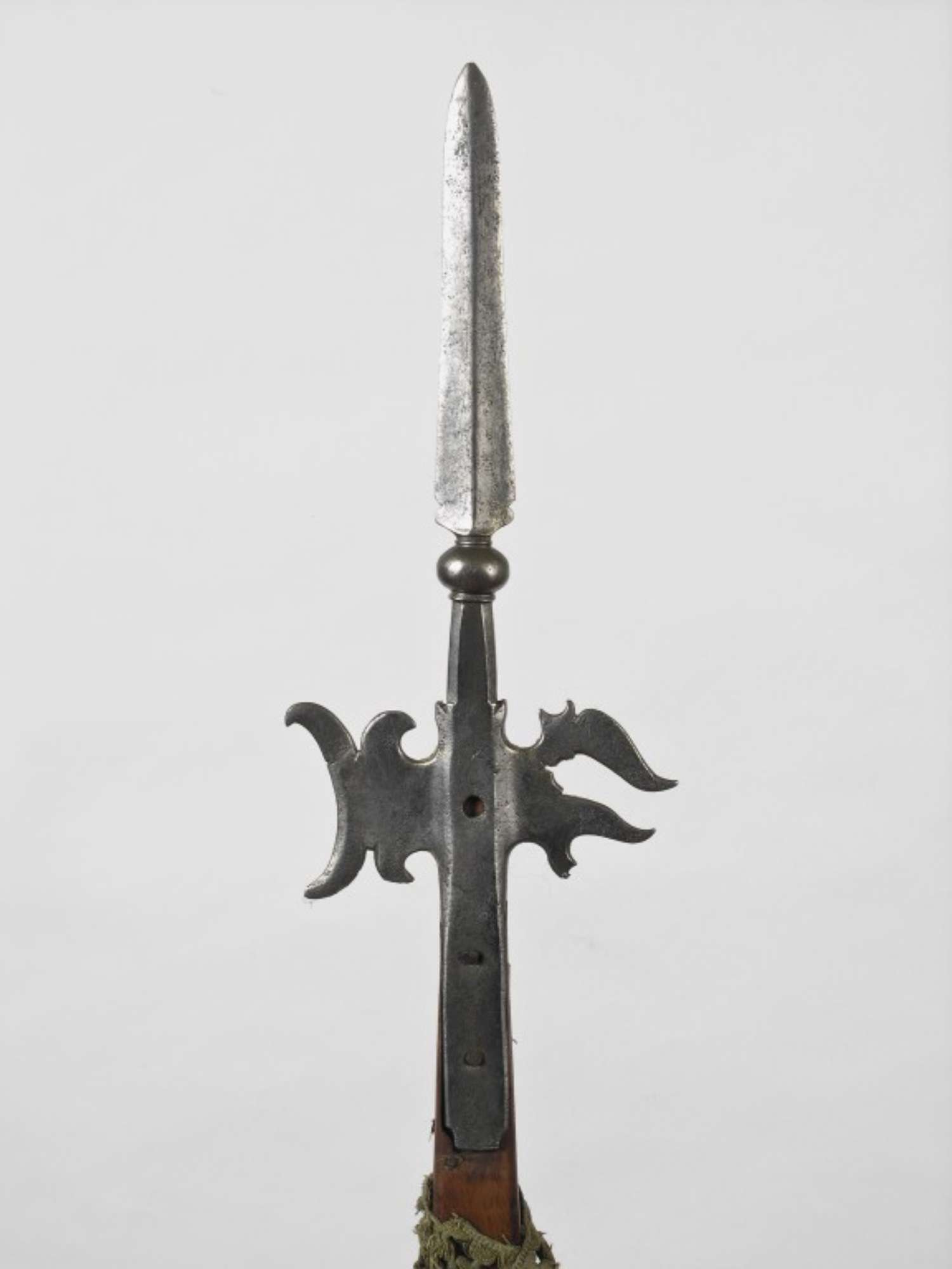 Gorbia in tronco di piramide rettangola che prosegue fino al nodo sferoide schiacciato compreso tra anellature. Ai lati escono la scuricina lunata con denti arricciolati e il becco sagomato a più punte. La cuspide a lama, in sezione di losanga, è sagomata allo stacco.