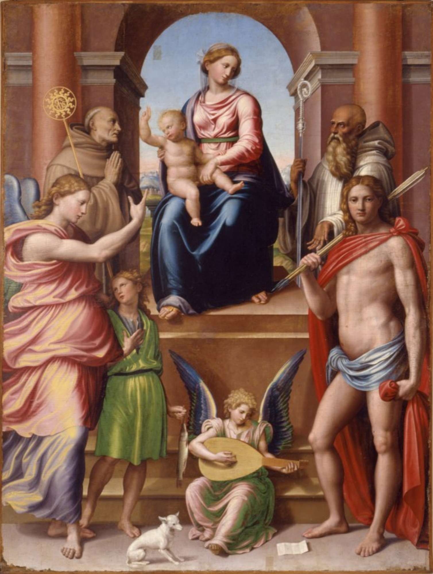La Beata Vergine seduta in trono, in alto, regge fra le braccia il bambino nudo. A destra vi sono San Bernardino da Siena e l'angelo Raffaello, con Tobia e a sinistra San Romualdo con il pastorale e San Sebastiano nudo. Seduto sul gradino del trono, un angioletto suona un liuto. Alla sua destra, vi è una cedoletta con l'iscrizione.