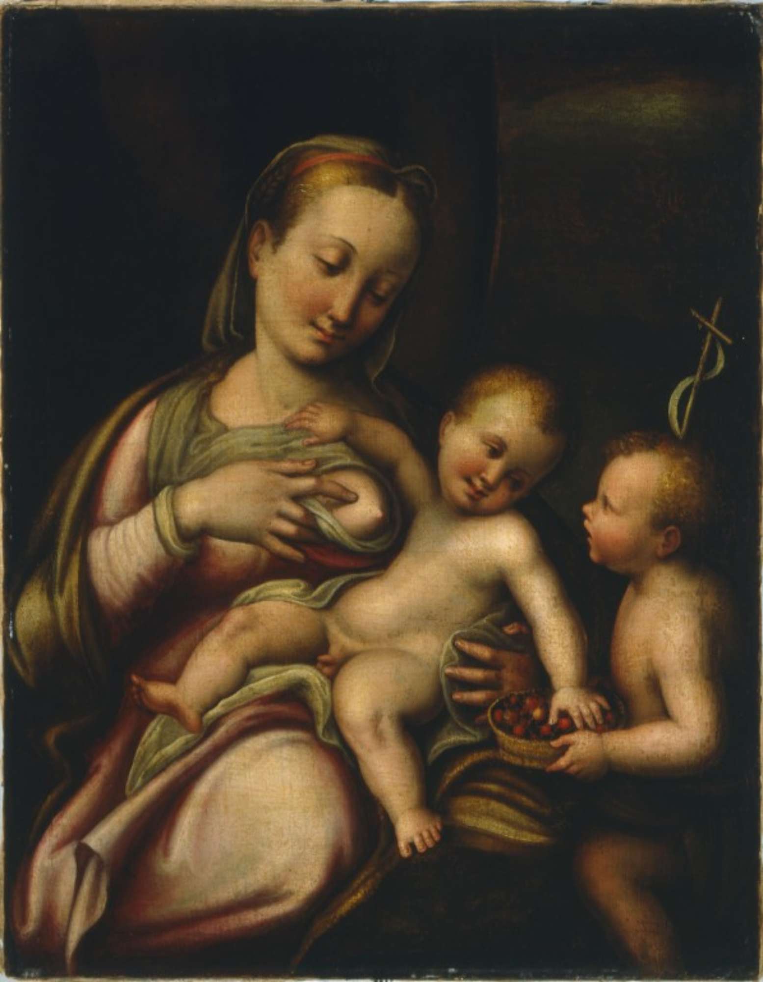 La Madonna tiene fra le braccia il Bambino nudo e gli porge un seno per allattarlo. Il Bambino allunga la mano sinistra su un cestino di fichi che Giovannino tiene fra le mani.