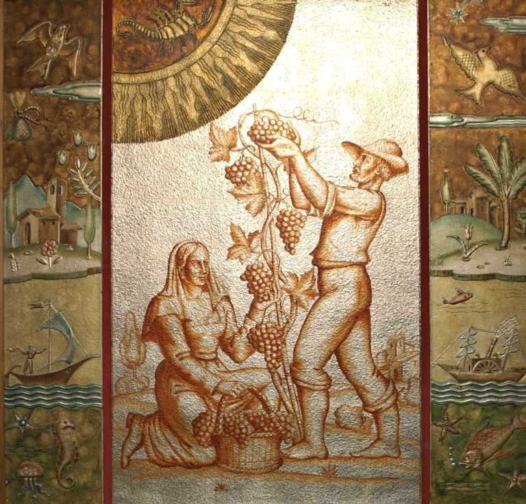 Figura centrale a monocromo raffigurante un contadino e una contadina che vendemmiano. In alto, entro uno spicchio di sole raggiato, il segno dello scorpione. Nelle due fasce laterali paesaggi marini, fondi marini, vedute, cieli, uccelli, divinità e mongolfiere in volo a marcati effetti cromatici (verde, giallo, azzurro, bruno dorato).
