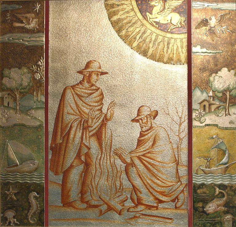 Figura centrale a monocromo raffigurante due contadini che si riscaldano attorno al fuoco. In alto, entro uno spicchio di sole raggiato, il segno del capricorno. Nelle due fasce laterali paesaggi marini, fondi marini, vedute, cieli, uccelli, divinità e mongolfiere in volo a marcati effetti cromatici (verde, giallo, azzurro, bruno dorato).