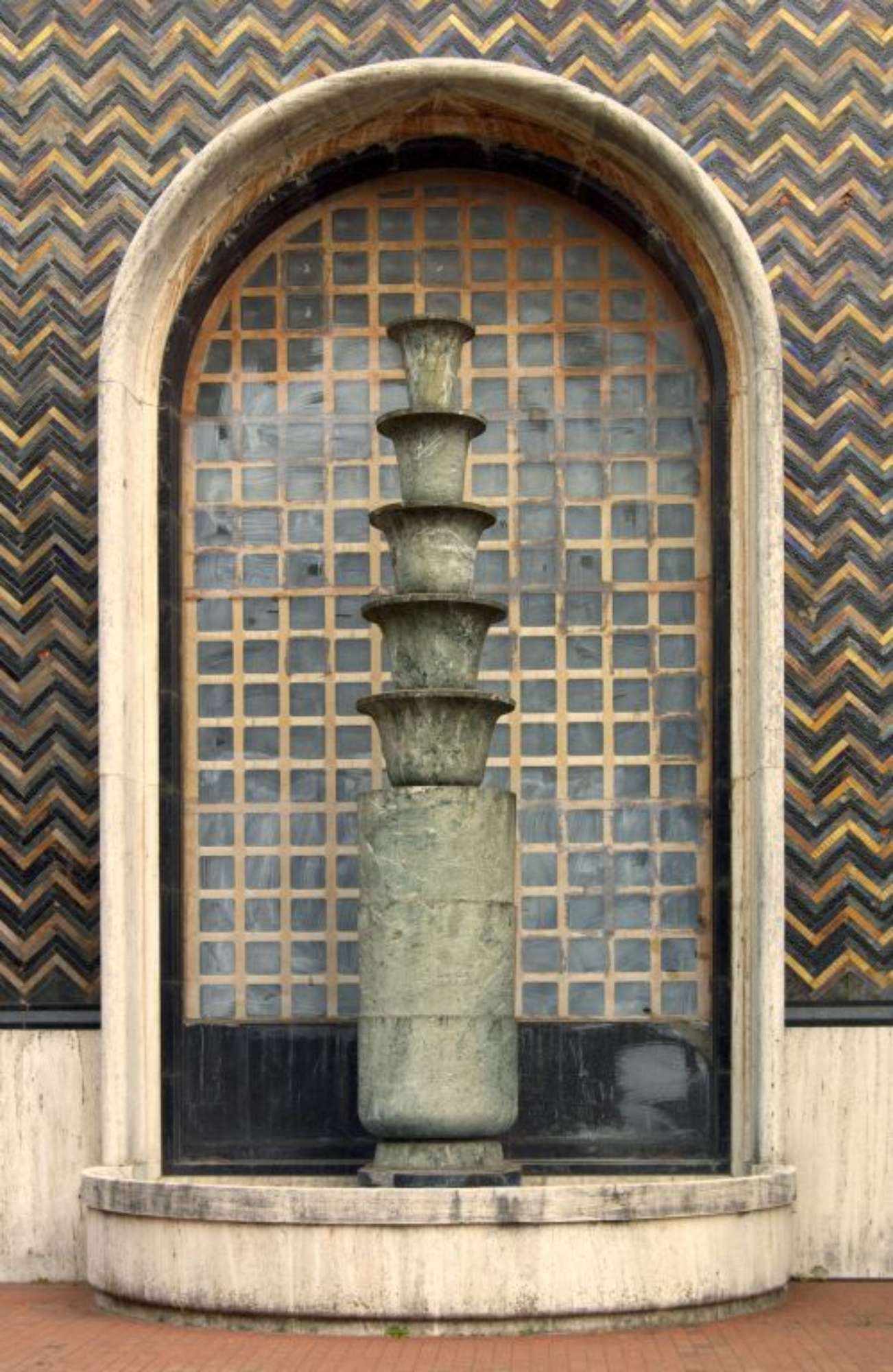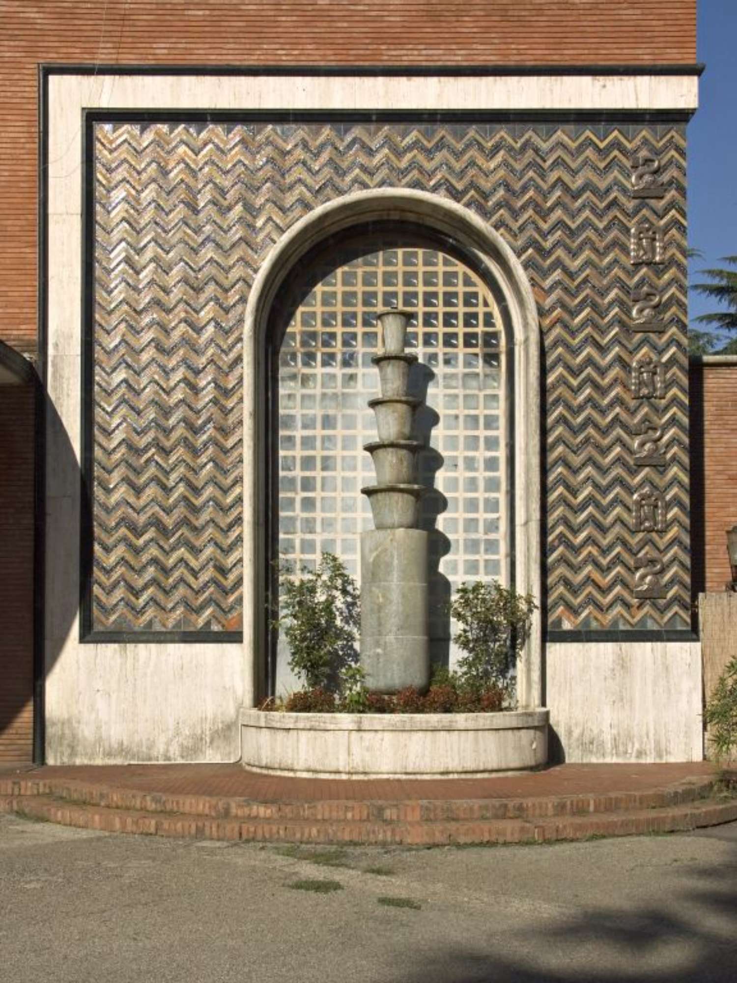 Ai lati del corpo aggettante semicircolare d'ingresso al padiglione, entro due nicchie in travertino con pareti in ceramica a lustro, sono collocate due fontane in marmo verde "a torsolo", cioè tre blocchi circolari sovrapposti con, sovrapposti, cinque elementi a scalare a forma di capitello a fiore di papiro.