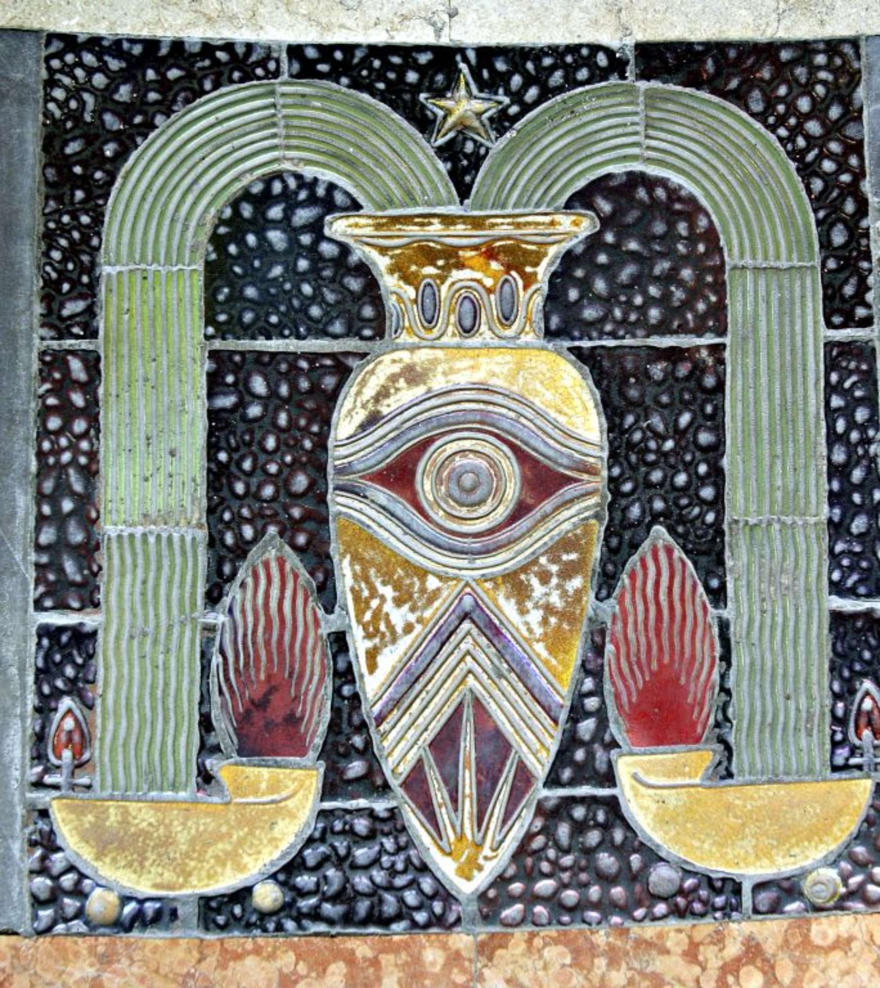 Mattonella decorativa del pavimento dei corridoi. Raffigura due anfore da cui esce l'acqua che va a cadere entro due lanterne. Al culmine una stella.