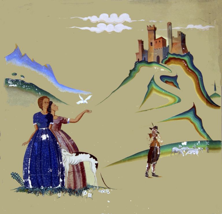 I due pannelli raffigurano due scene campestri con una rocca sullo sfondo.