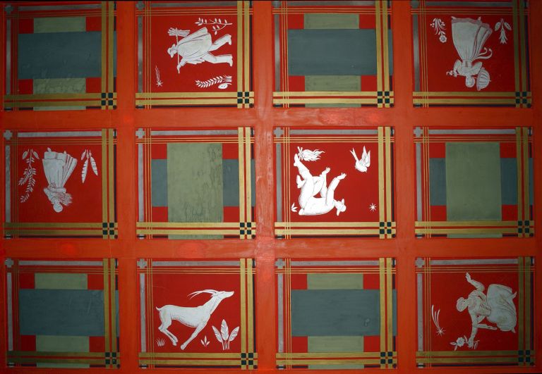 Soffitto a tempera: fondo rosso, riquadrature dorate con al centro pannelli verde-bruno o figurine bianche raffiguranti cacciatori, contadinelli, stambecchi e comete.