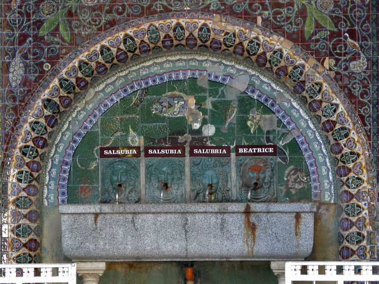 La fontana, incorniciata da una sorta di dossale in ceramica invetriata raffigurante un fondale marino, è costitutita da quattro mascheroni ceramici da cui sgorga l'acqua termale e da una vasca centrale per la raccolta dell'acqua in graniglia.