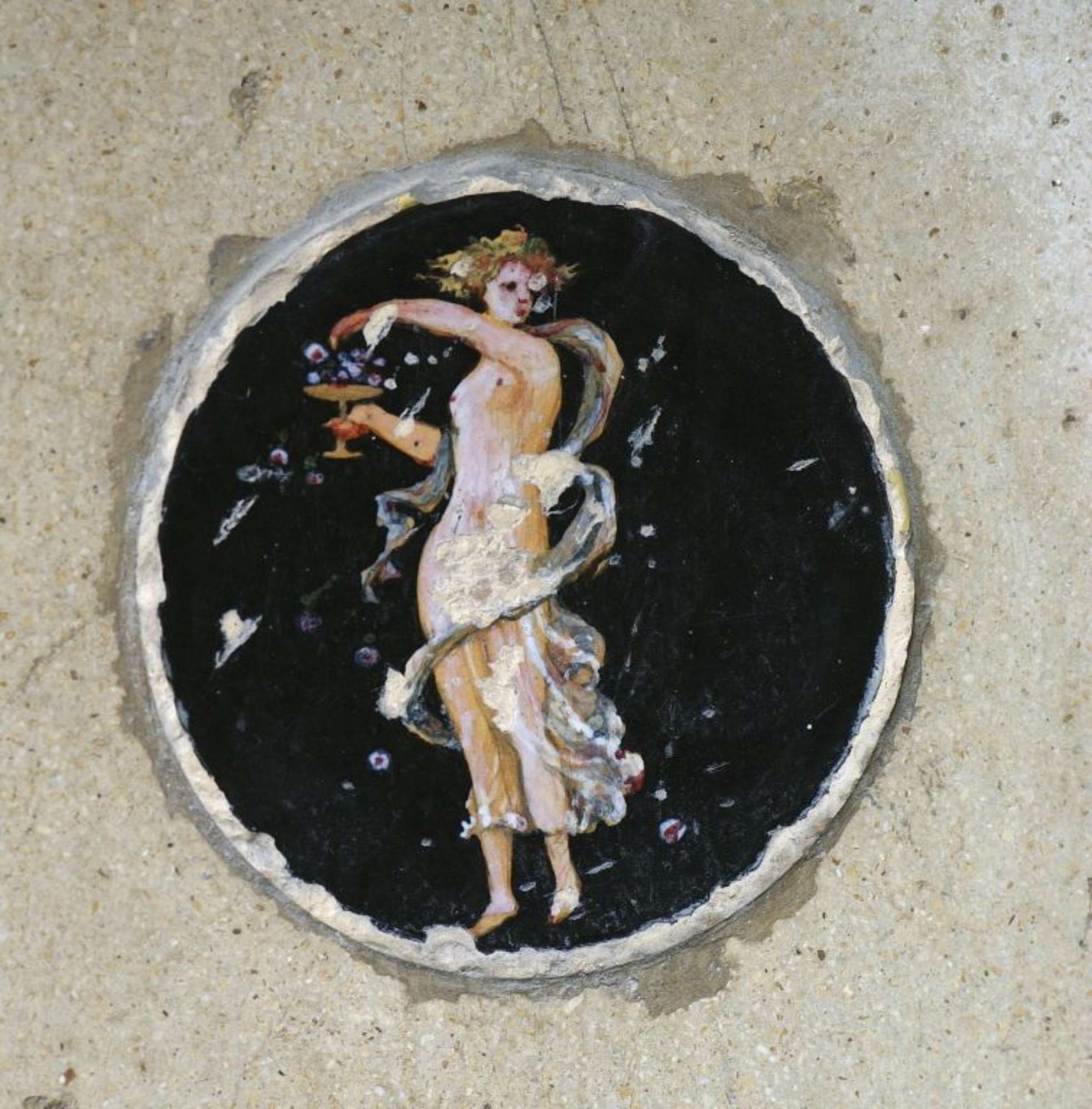Ai lati della fontana sono due piccole are in graniglia che presentano interessanti inserti decorativi: due tondi di ceramica dipinta raffiguranti danzatrici su fondo nero.