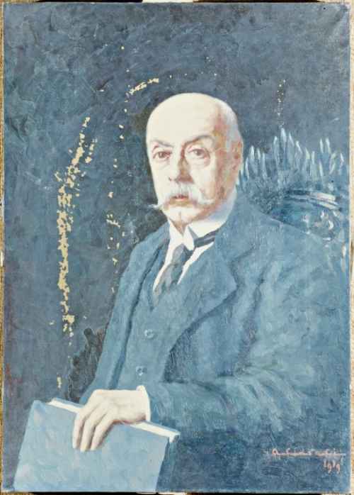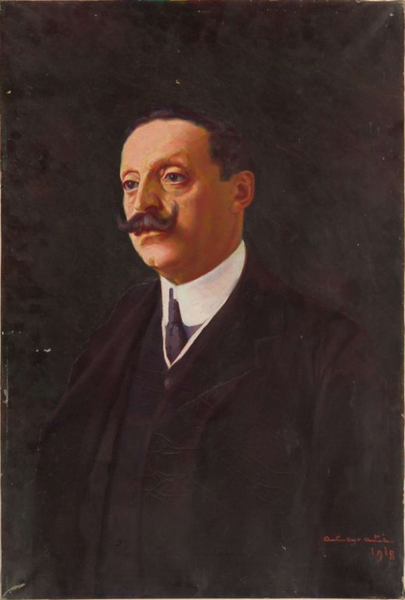 Ritratto d'uomo a tre quarti. Grandi baffi neri all'insù, camicia bianca, cravatta nera ed abito scuro.