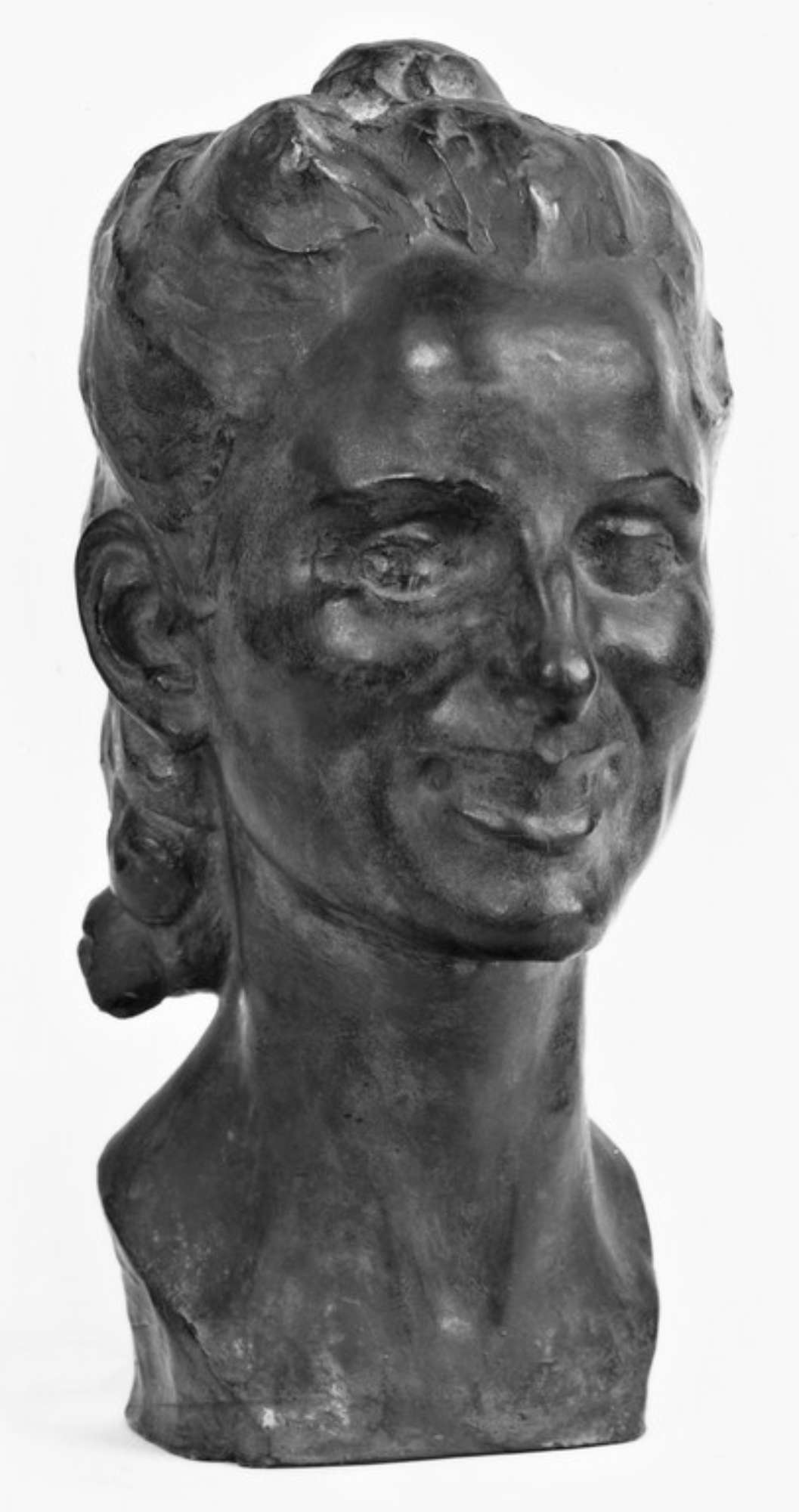 Ritratto femminile in gesso patinato scuro. La donna ha i capelli raccolti in una coda ed il volto sorridente.