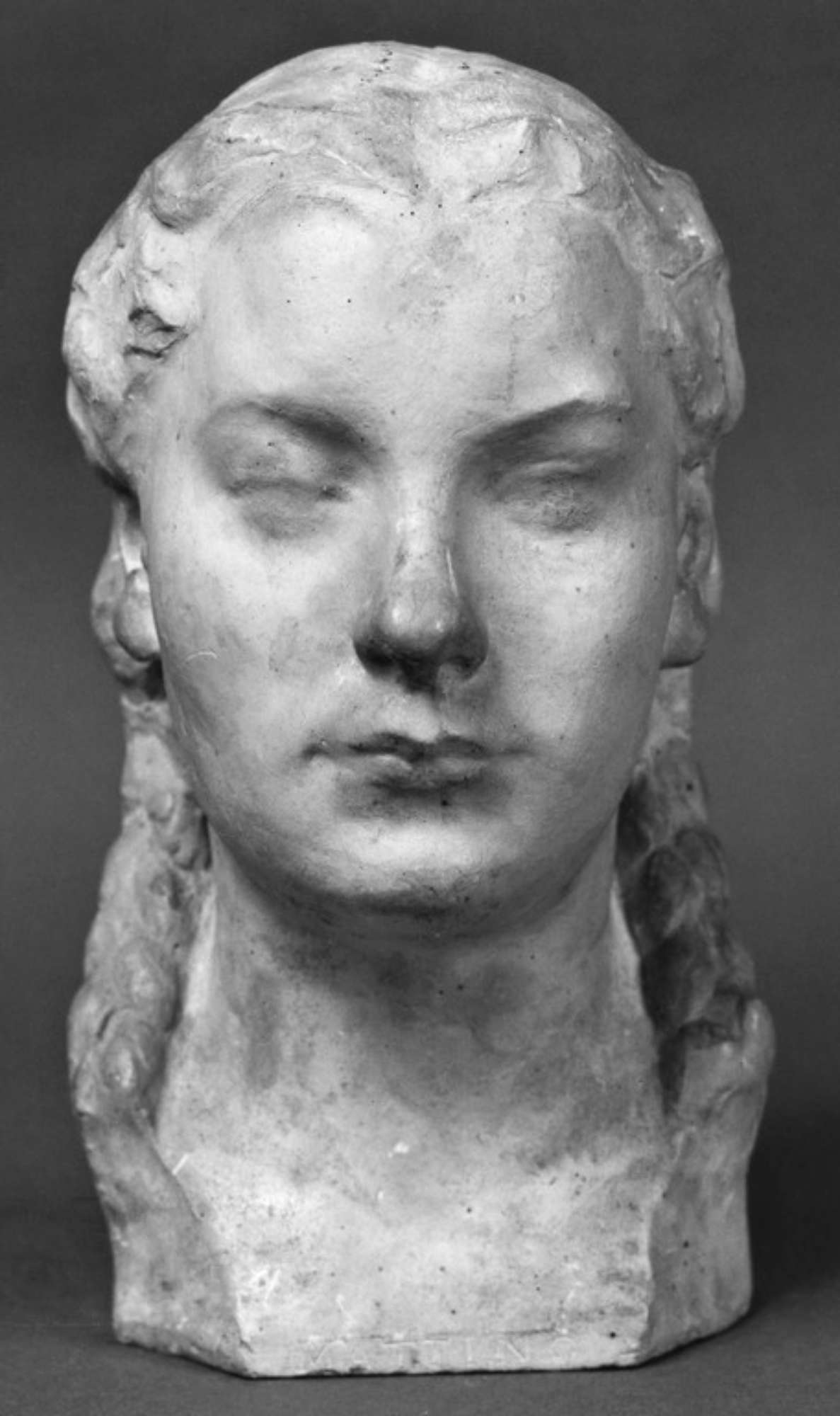 Ritratto femminile in gesso chiaro. La ragazza ha i capelli raccolti in due trecce.