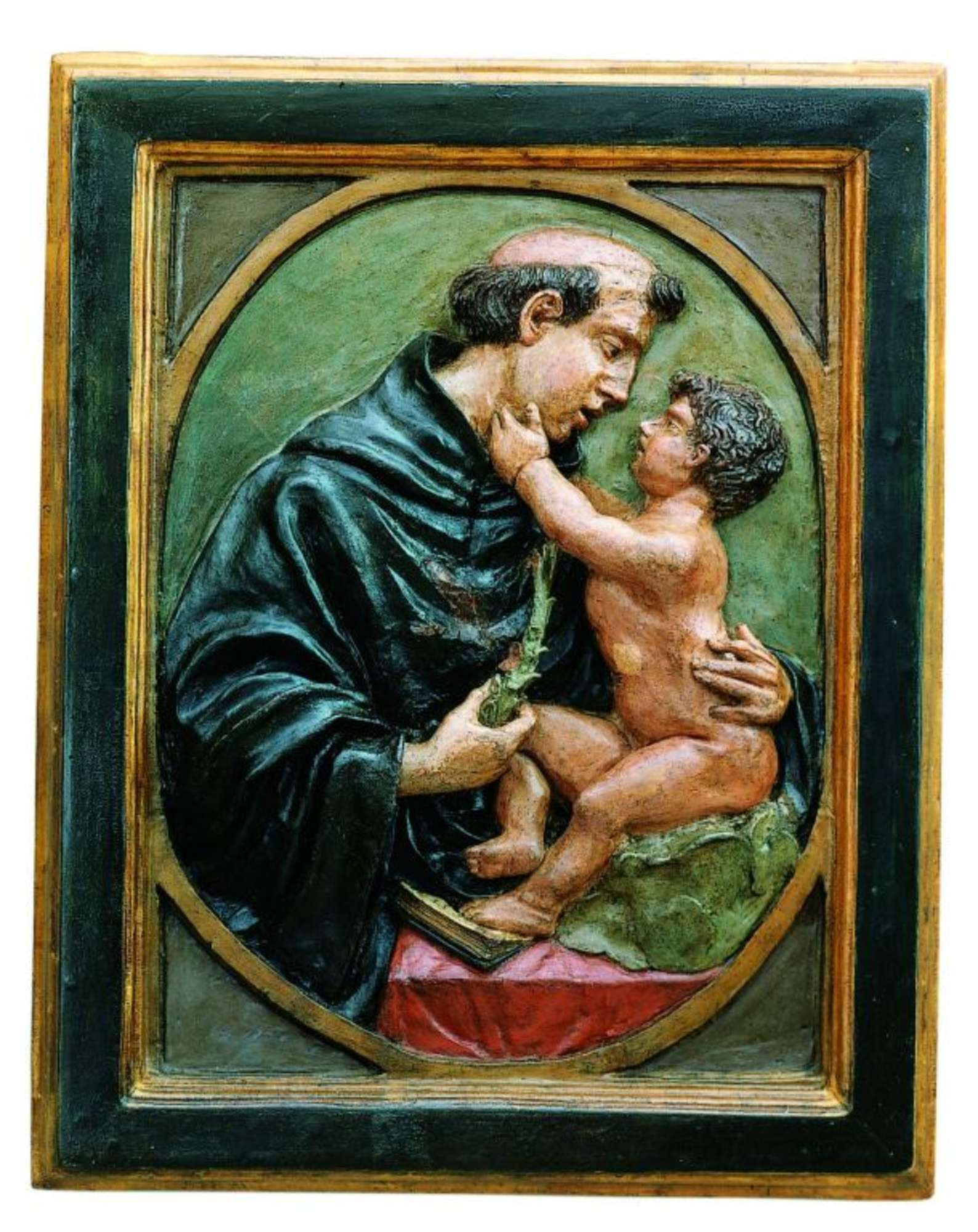 Il santo rappresentato a mezza figura accoglie fra le braccia Gesù Bambino seduto su una nuvola. Il Bimbo appoggia il piede destro su un libro aperto. Il santo regge con la mano destra il caratteristico giglio che purtroppo l'incuria del tempo ha divelto.