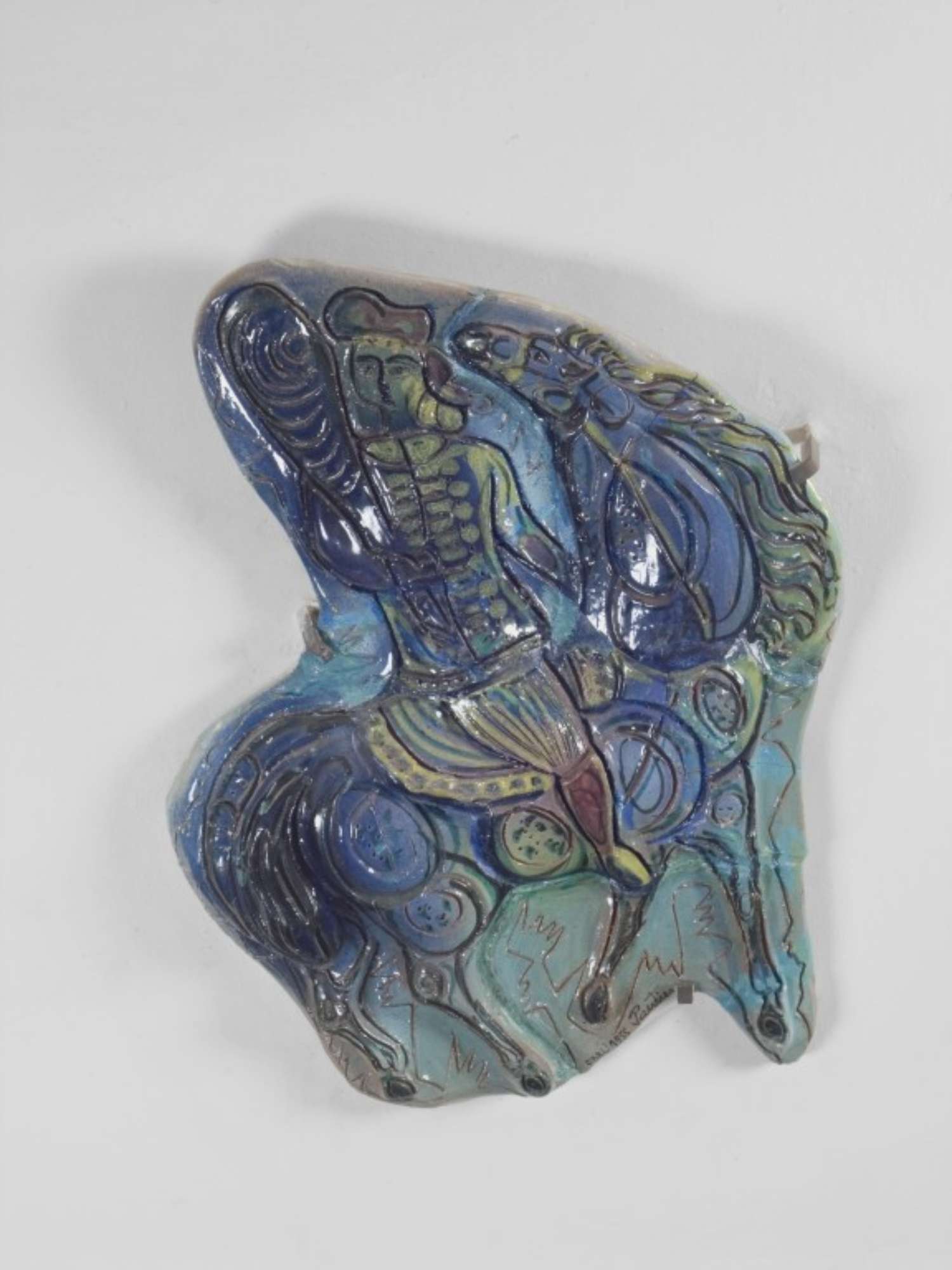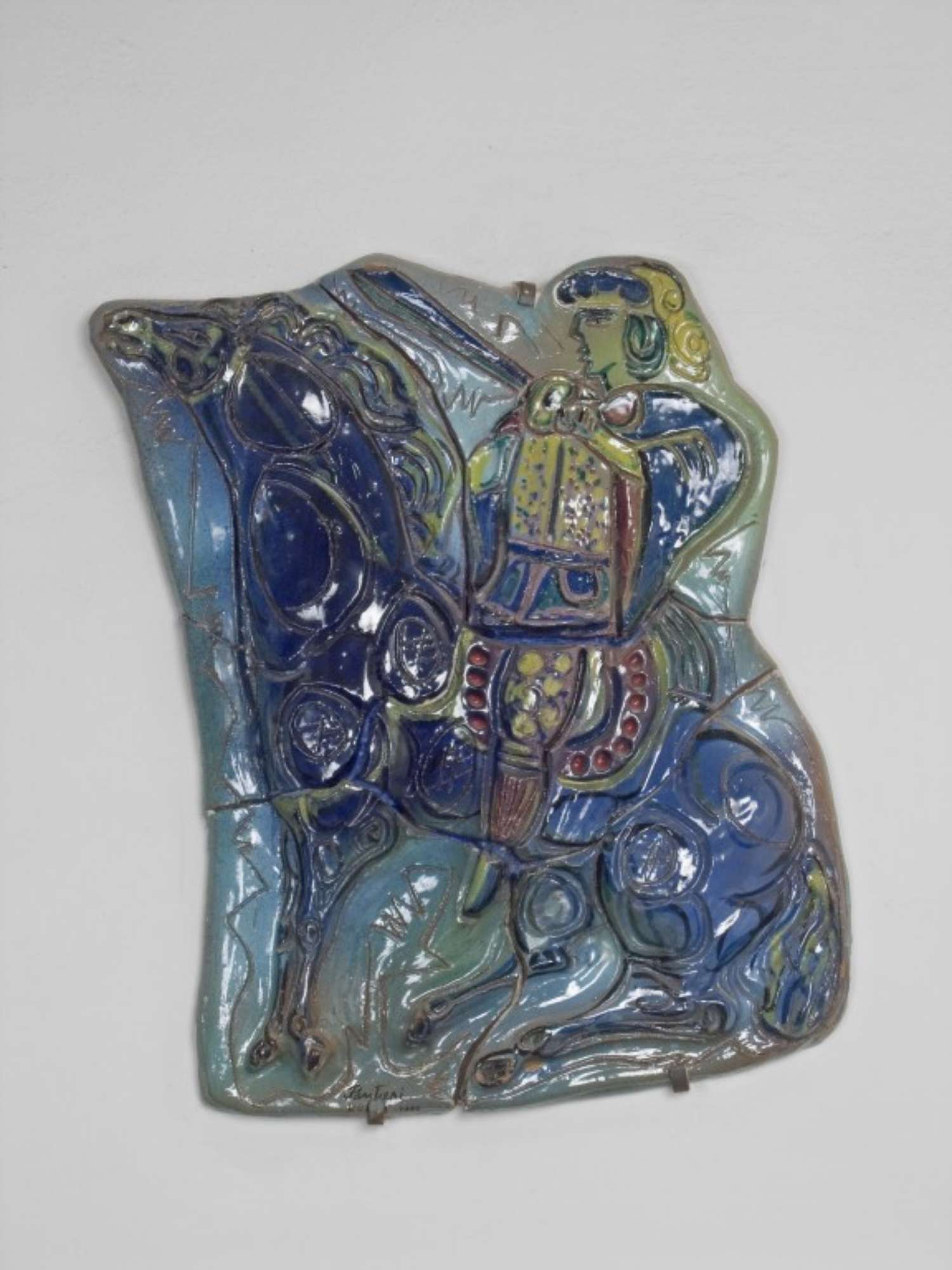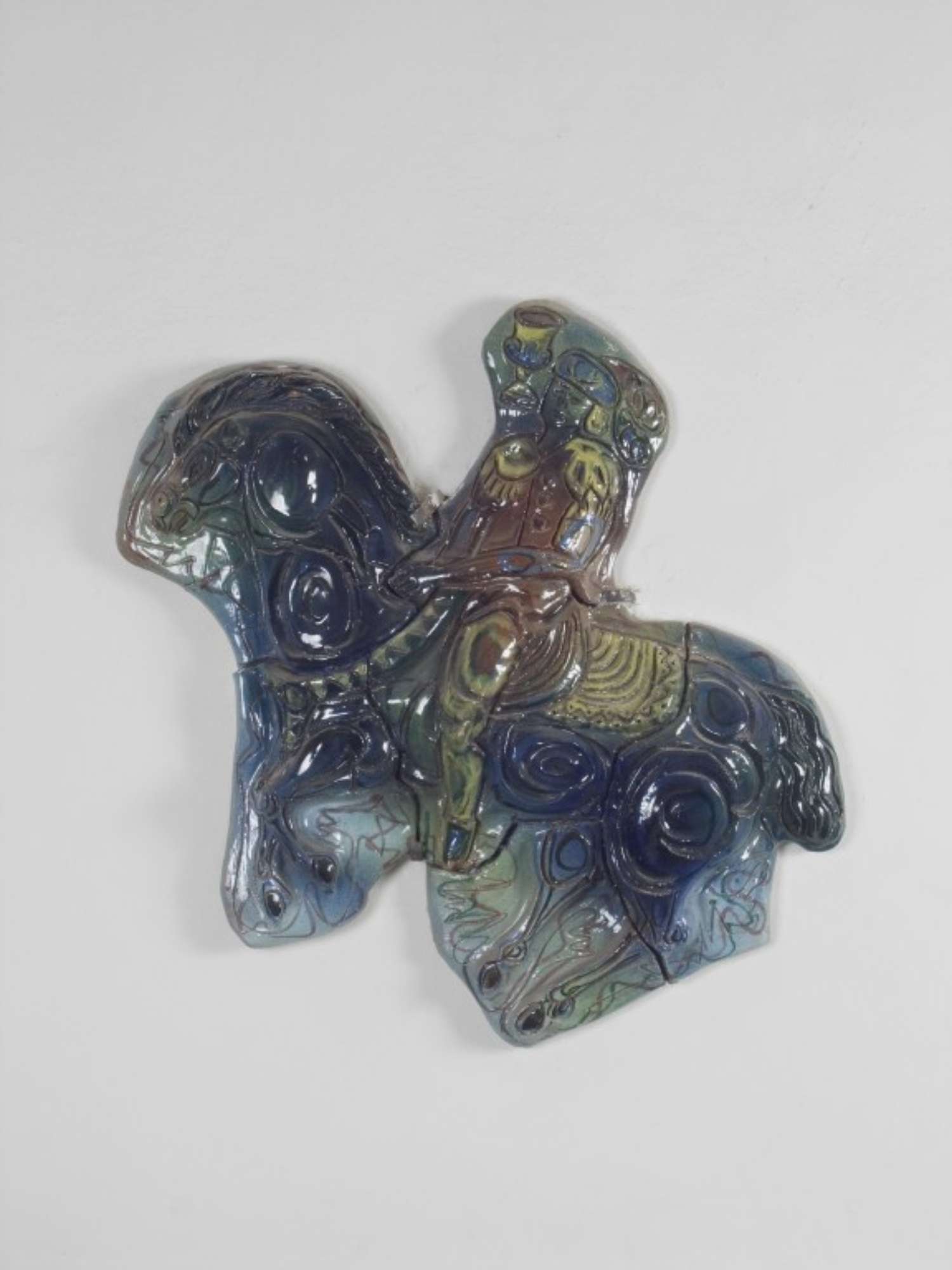 Insieme di quattro grandi formelle in maiolica policroma dalle forme irregolari e rappresentanti i cavalli delle carte da gioco romagnole, la n. 1 i denari, la n. 2 i bastoni, la n. 3 le coppe, la n. 4 le spade. Solo per i denari e le coppe dalla forma dell'opera è riconoscibile una sagoma di cavallo. I colori dominanti sono il blu, il giallo ed il rosso terra.