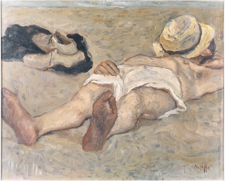 Uomo sdraiato sulla spiaggia con cappello di paglia sulla faccia. Di fianco sono appoggiati i vestiti e le scarpe. L'uomo è in mutande bianche ed è ripreso dai piedi.