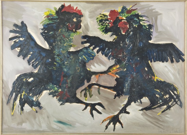 Scena di lotta tra due galli scuri con bargigli rossi. La rappresentazione è concitata e trattata con movimenti veloci del pennello.