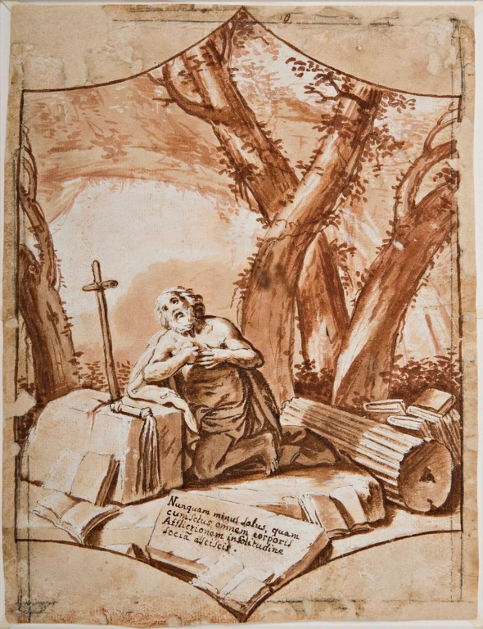Il disegno è stato acquistato dal prof. Lamberto Maggioli nel 1986 insieme ad altri cinque episodi della vita di San Girolamo (n. inv. 164/ 165/ 167/ 168/ 169 PDS), per la somma di Lire 4.500.000 (cfr. delibera G. M. 1294 del 18/6/'86). Essi costituiscono alcuni bozzetti per le ventisei storie di San Girolamo, che il Pronti eseguì, in monocromo su tela, nel 1687 per gli stalli lignei della distrutta Chiesa di San Girolamo, ora conservati nel vicino oratorio di San Giovannino. Probabilmente i disegni sono quelli ricordati nel 1888 da Carlo Tonini nella collezione riminese del Conte Cesare Battaglini.