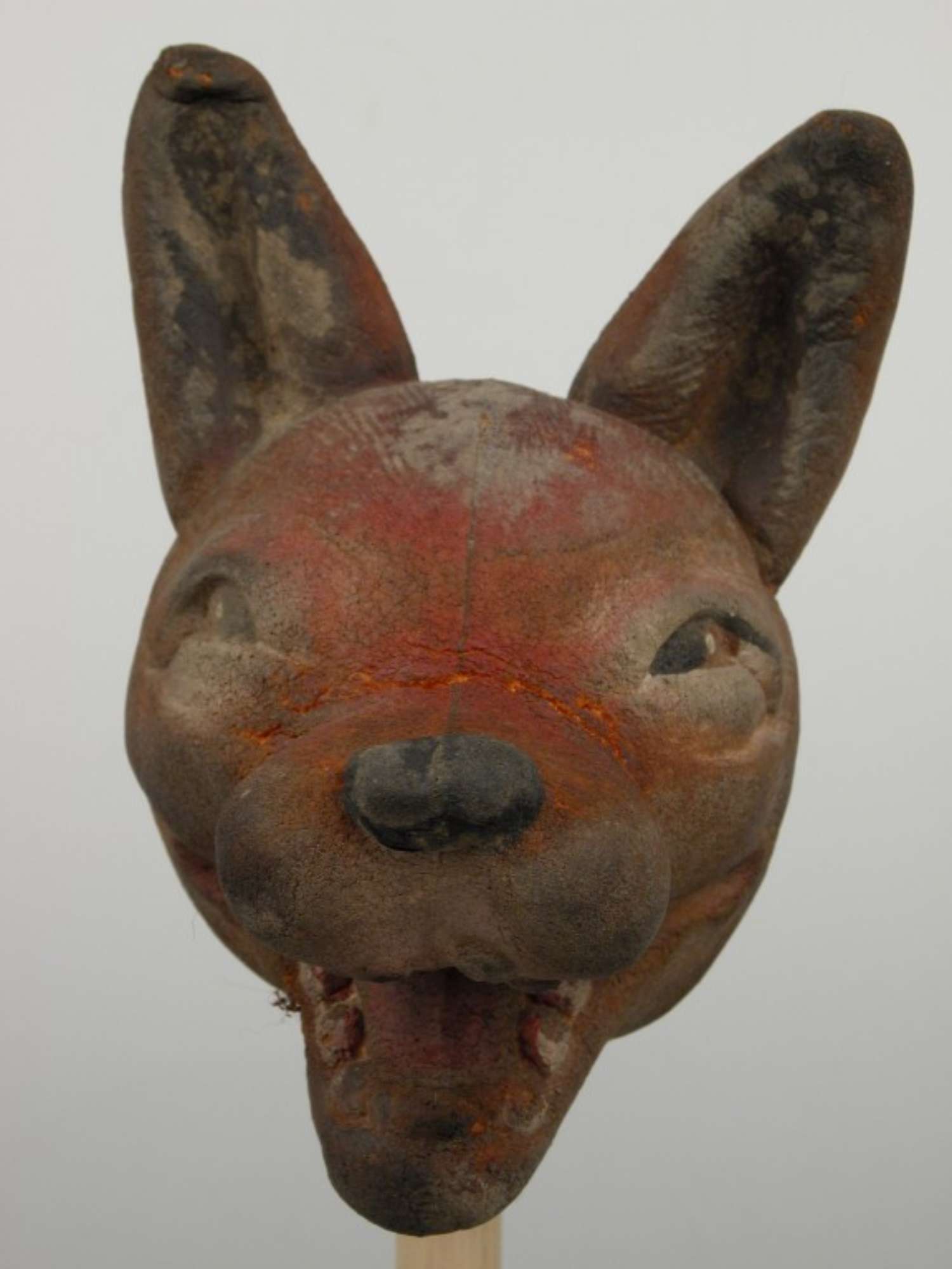 Il pupazzo in esame è una testa raffigurante una volpe con le fauci aperte.