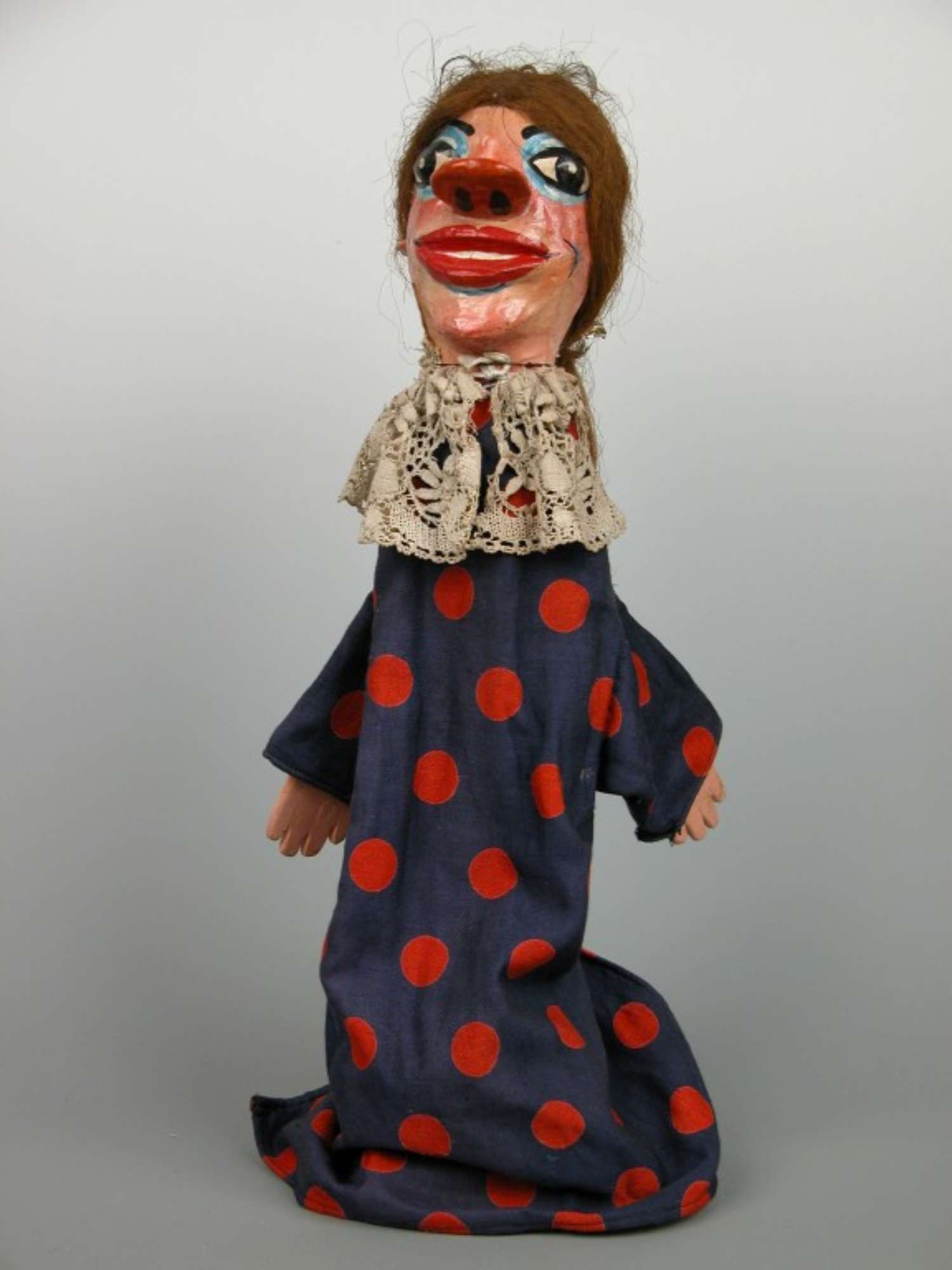 Il burattino in esame raffigura una figura femminile con capelli castani raccolti dietro alla nuca, una grande bocca sorridente e occhi truccati di azzurro. Indossa un abito blu con grandi pois rossi e un colletto in pizzo bianco.