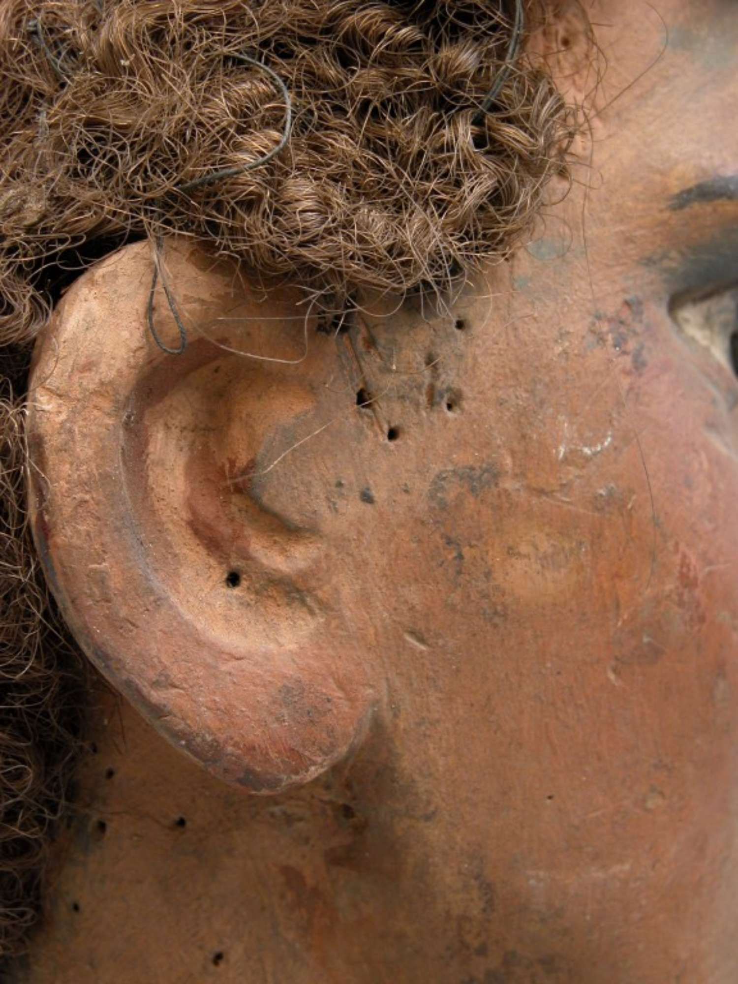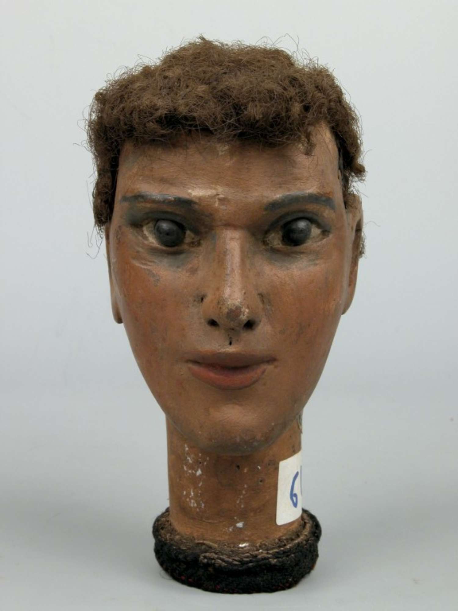 La testa di burattino in esame raffigura un volto maschile ovale coi capelli corti e ricci di colore castano e gli occhi neri dipinti. Alla base del collo vi è un collarino in stoffa nera.