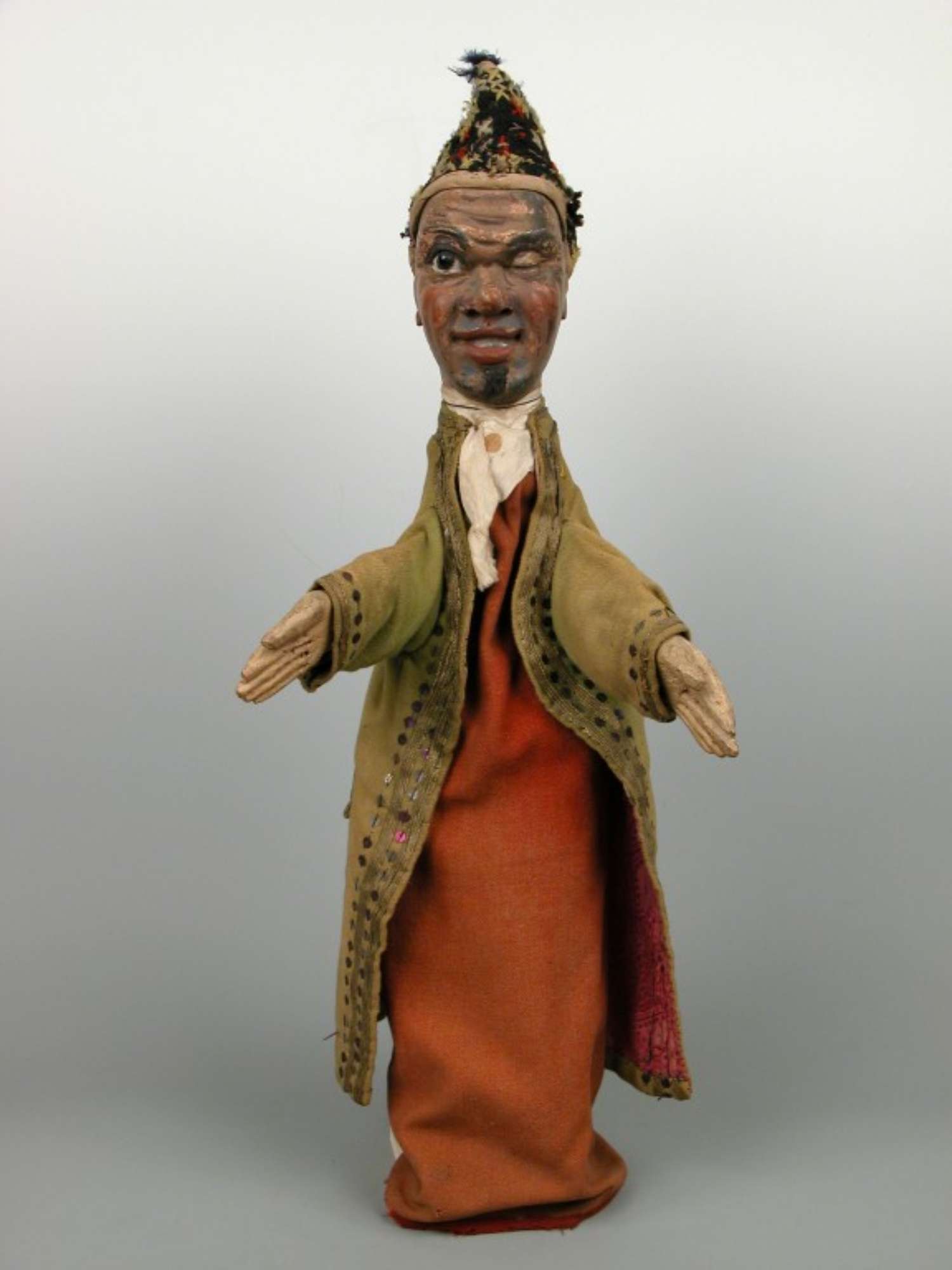 Il burattino in esame rappresenta una figura maschile giovanile e sorridente, con carnagione scura. Sul mento porta un pizzetto nero e l'occhio sinistro è chiuso. Sul capo porta un cappello di foggia orientale. Indossa un pastrano lungo, di colore verde con paillettes dorate; come abito indossa una tunica color aragosta con colletto bianco.