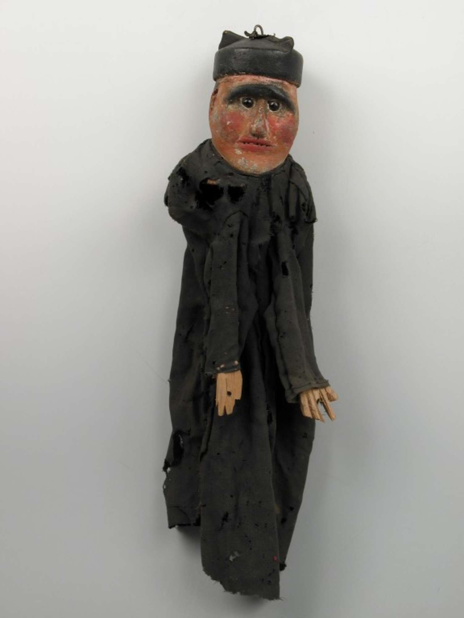 Il burattino in esame rappresenta una figura maschile con un'espressione triste. Ha folte ciglia e occhi neri in pasta di vetro. Indossa un abito nero e un cappellino nero in legno, ricavato dallo stesso legno con la testa.