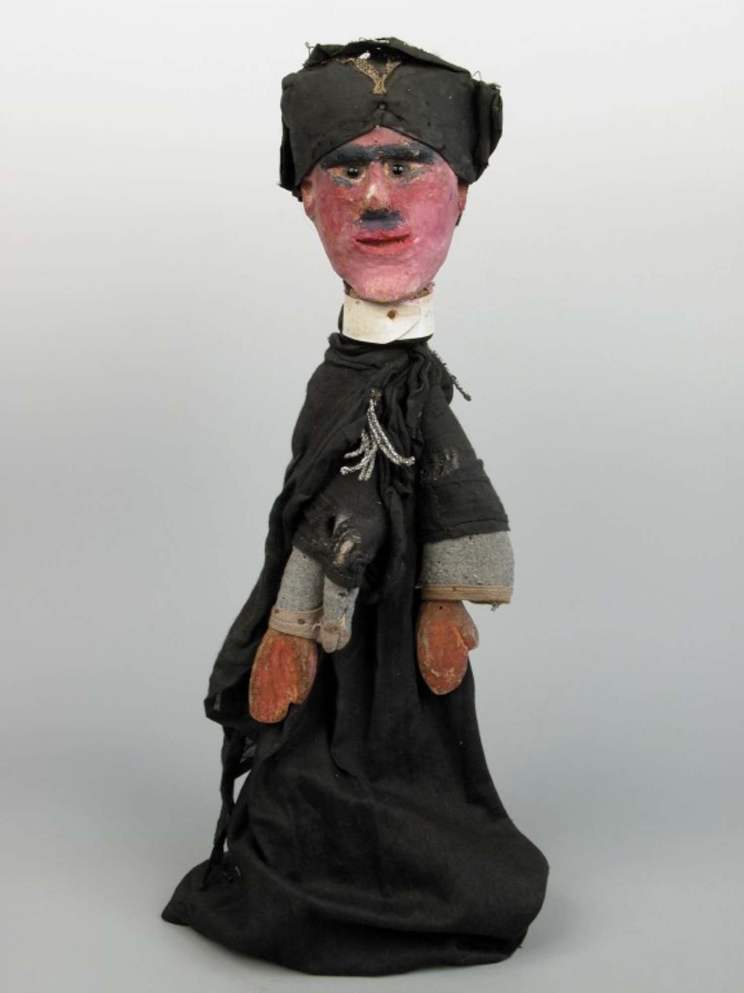 Il burattino in esame rappresenta una figura maschile con colorito acceso e baffetti. Indossa un vestito nero e grigio e un mantello nero allacciato al collo; in testa ha un cappello con un fregio dorato al centro.